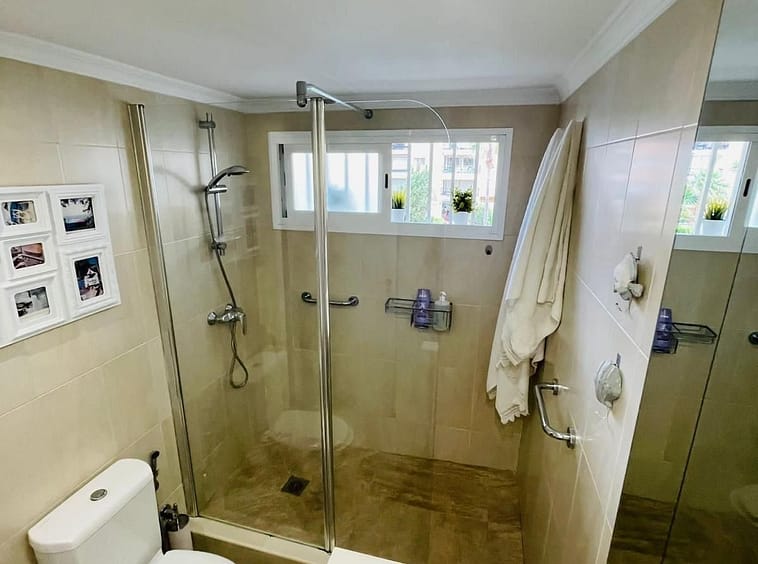 The fully renovated bathroom showcases a modern and functional design, fitted with a walk-in shower.