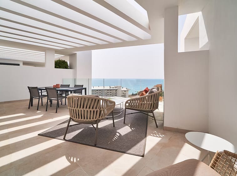 The apartments boast spectacular sea and mountain views, combined with a remarkable sense of space and natural light thanks to the southwest orientation, large terraces, and floor-to-ceiling windows that flood the interiors with daylight throughout the day.