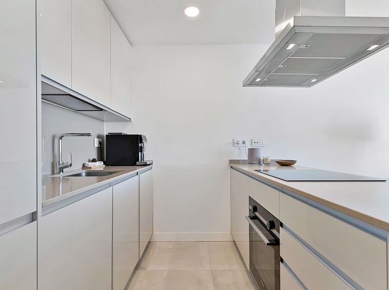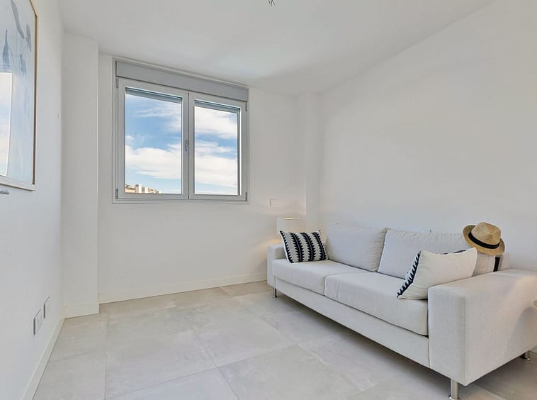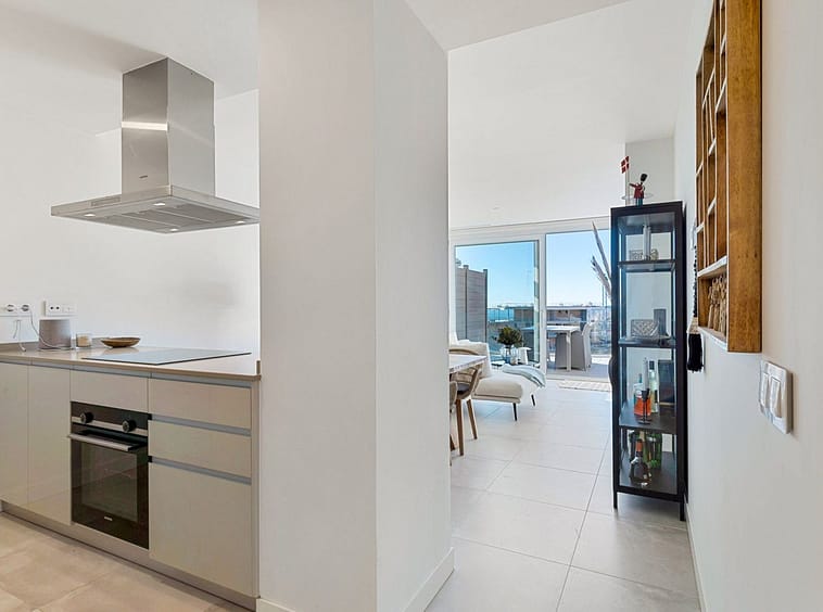 Large sliding doors lead from the living room onto a generous terrace. From here, you can enjoy impressive panoramic views of the Mediterranean Sea. The terrace offers plenty of space for dining, relaxing and enjoying the sun throughout the day.