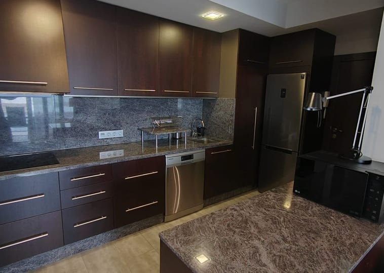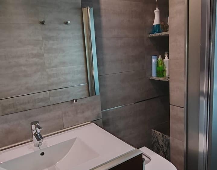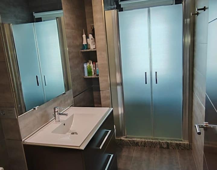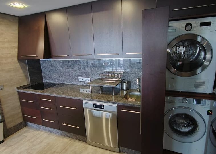 The property offers approximately 60 m², distributed into 2 bedrooms with fitted wardrobes, 2 full bathrooms with walk-in showers, and a fully equipped open-plan kitchen with breakfast bar, integrated into a bright and welcoming living-dining area.
