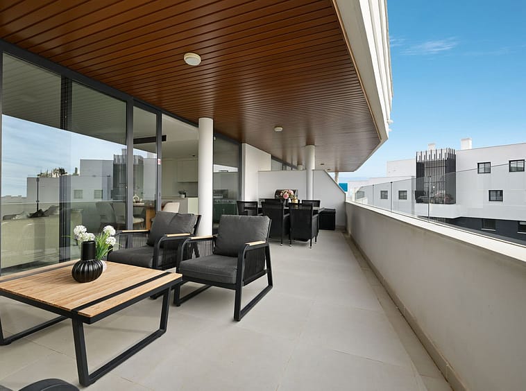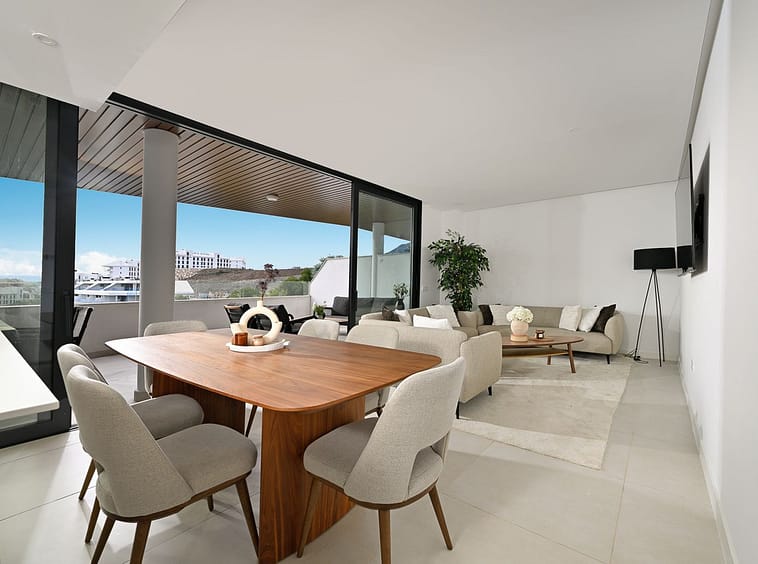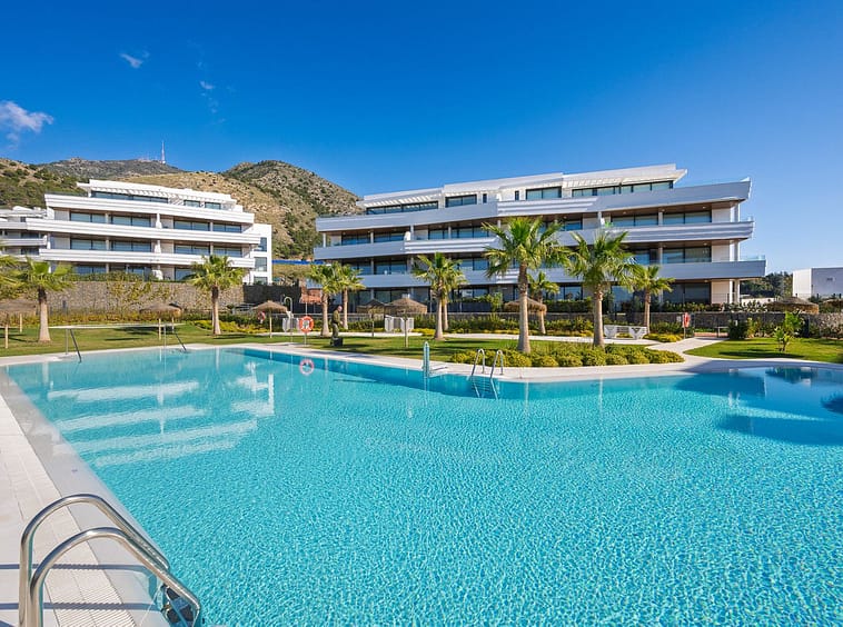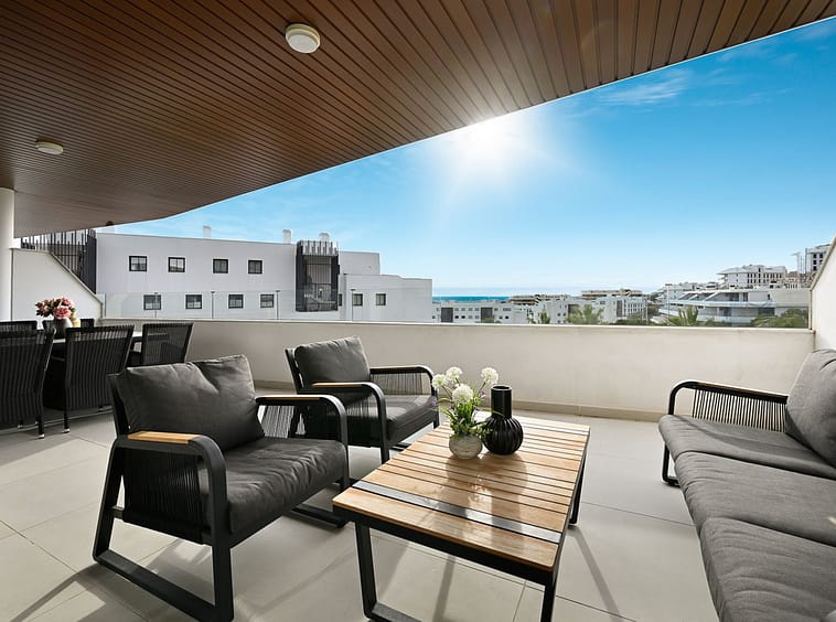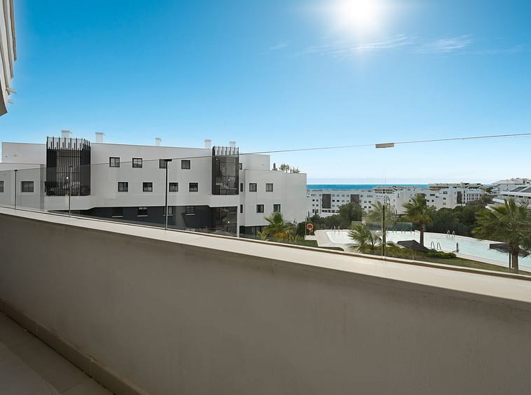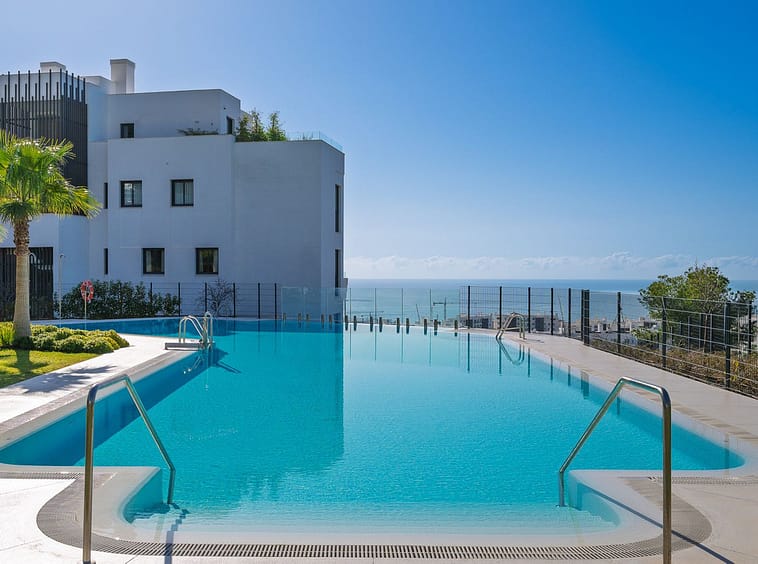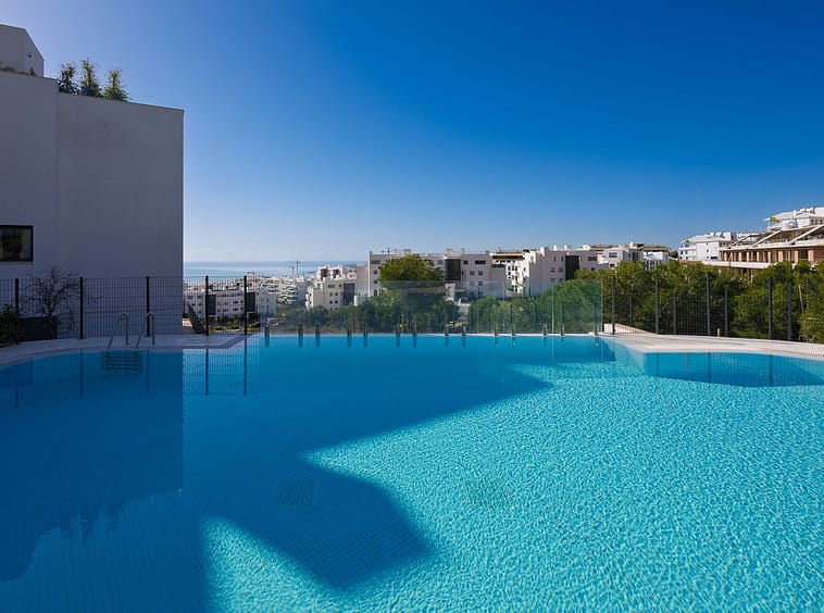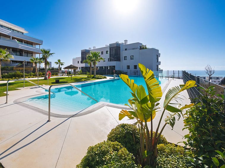 The apartment features a generous interior space complemented by a 34m² private terrace. The terrace offers panoramic, mountain, garden, pool, urban, and partial sea views, making it a perfect spot for outdoor dining or simply enjoying the Mediterranean climate. The communal saltwater swimming pool and landscaped gardens further enhance the appeal, whilst two private garage spaces and a storage room add to the convenience.