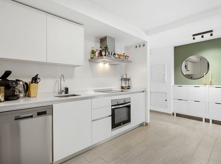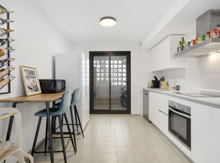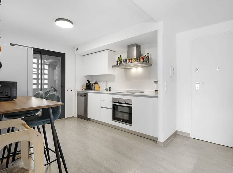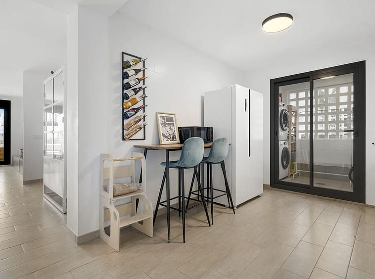 Upon entering, on the left side, there is a spacious, semi-open kitchen equipped with all necessary built-in appliances. Next to the kitchen, there is a separate, enclosed room where the washing machine and dryer are also located.