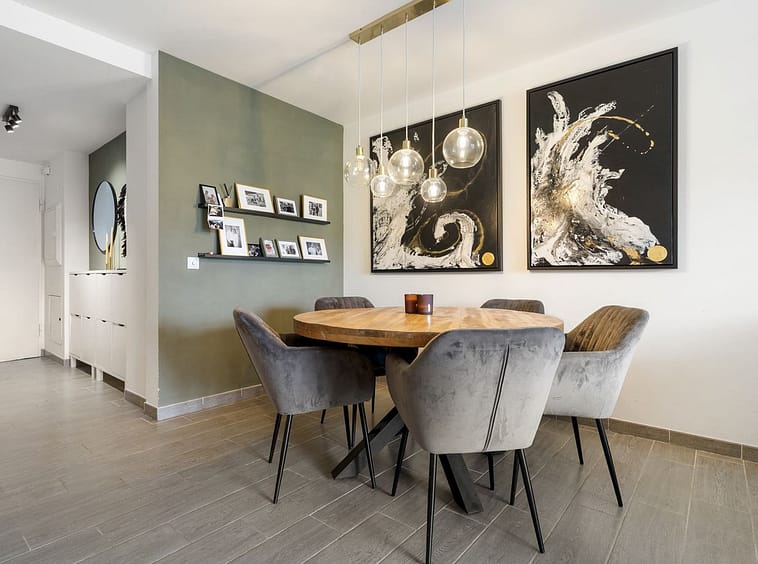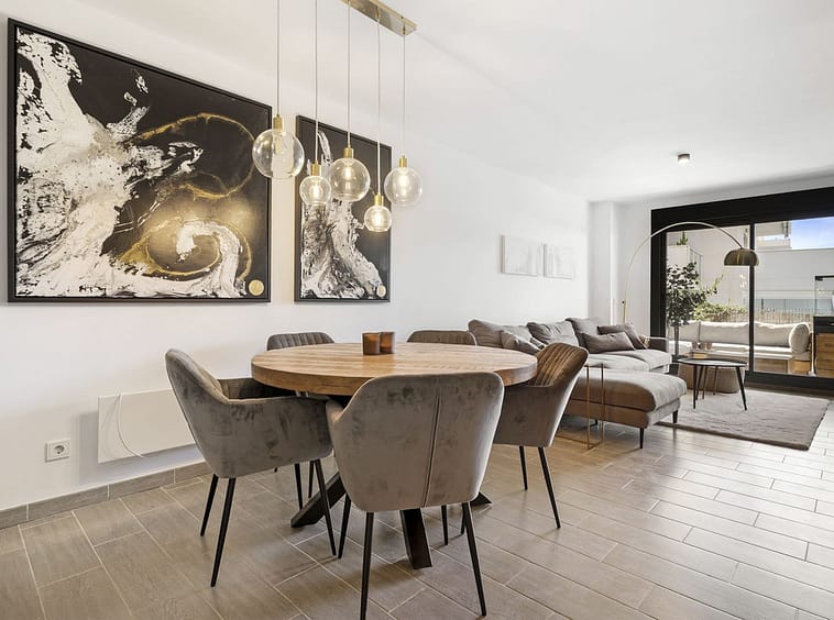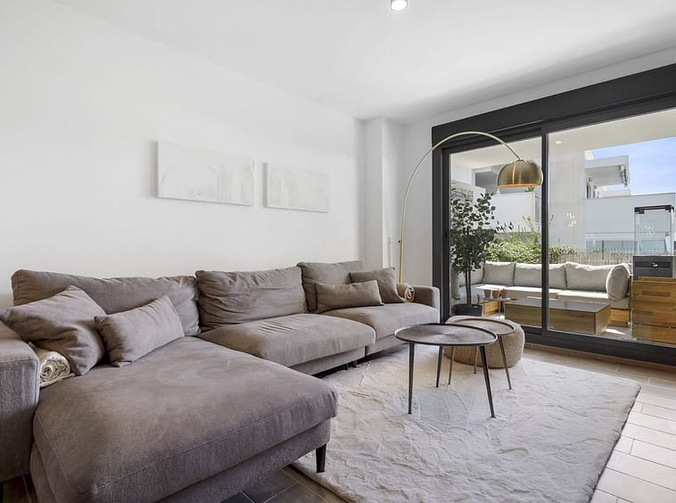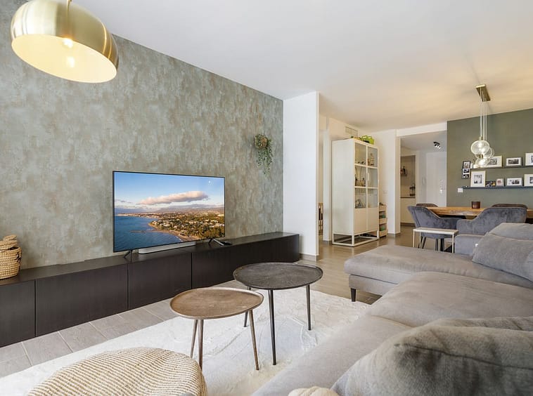 From the kitchen, you enter the spacious living room, which offers space for a large dining table and a generous seating area. From the living room, you can access the garden.