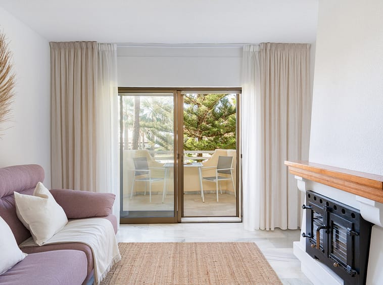 This apartment is situated in a prestigious, gated first-line beach community with extensive, beautifully maintained gardens. It enjoys lovely views of the sea and the surrounding greenery. The south-facing orientation provides plenty of natural light, and the balcony is a perfect spot to relax and enjoy the view. Inside, a cozy fireplace adds a welcoming touch. The community offers excellent facilities, including a tennis court, a paddle court, a social club, and two swimming pools.