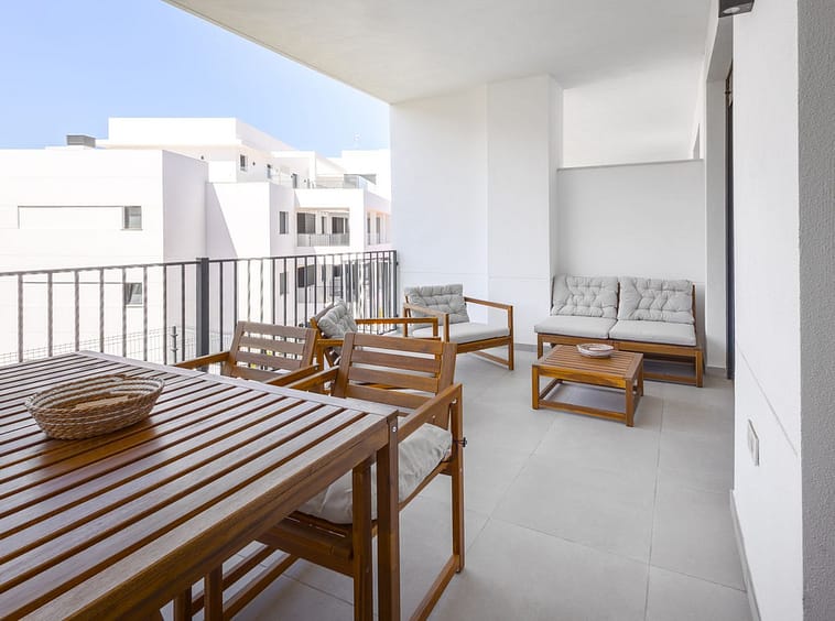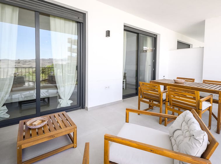 The spacious living room opens onto a large private terrace featuring a dining area and a cozy lounge set—perfect for unwinding after a day exploring the Costa del Sol. From the terrace, a staircase leads down to a beautiful garden where you can enjoy the peaceful surroundings.