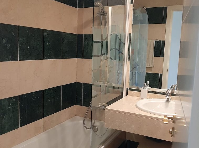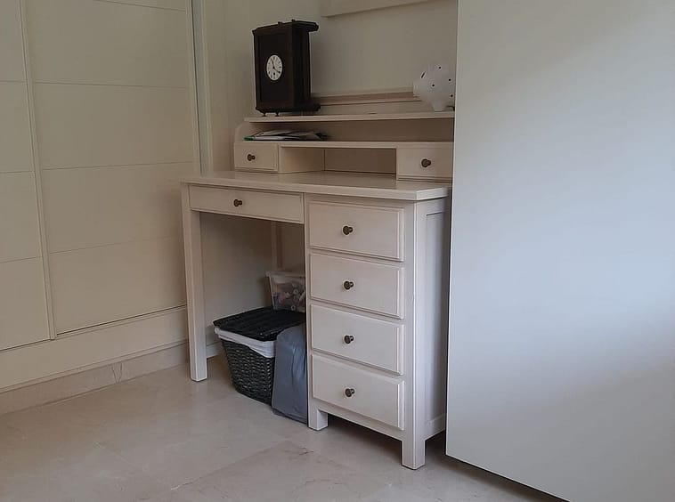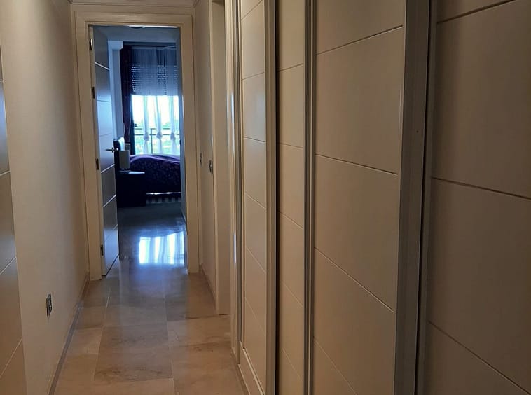 Elevated ground floor apartment with fantastic sea views. 2 beds and 2 baths (one of them en suite) located in the luxurious front line golf urbanization, Calanova Sea Golf. Spacious bedrooms have large built-in wardrobe, there is also a large wardrobe in the wide hallway between the two bedrooms that separates the sleeping area from the kitchen and the living room.