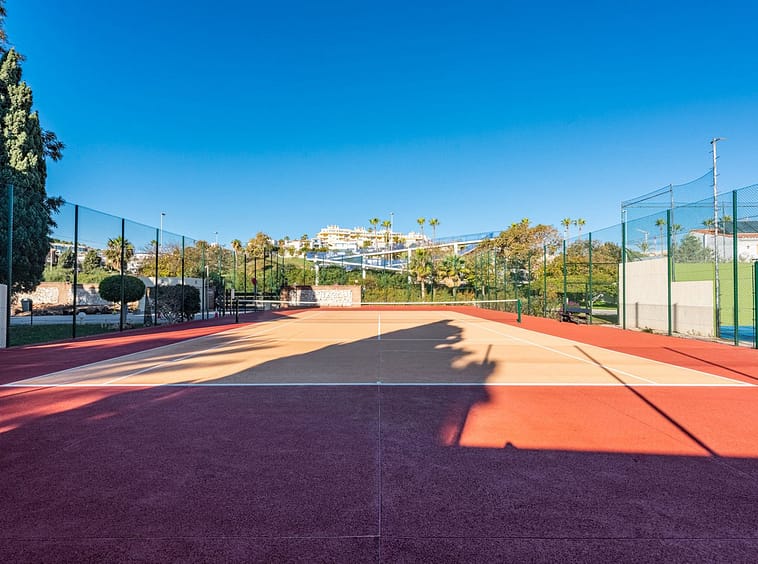 Large communal gardens, two swimming pools, tennis and padel courts, community office and clubhouse.