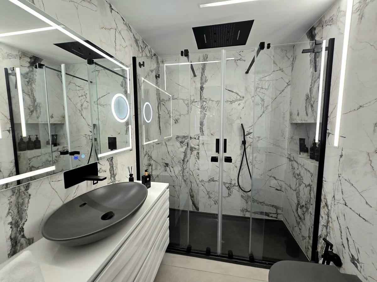 Impressive solarium on the upper floor, featuring a full bathroom and outdoor shower, perfect as an exclusive chill-out area.