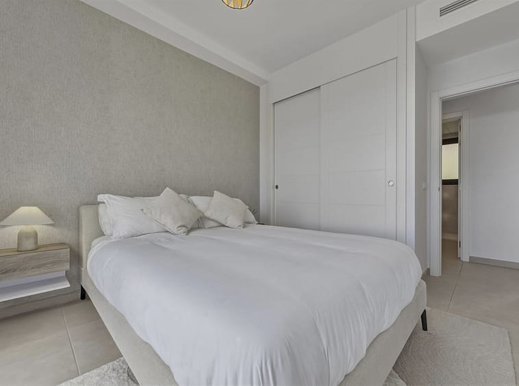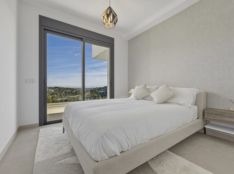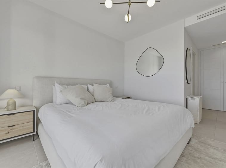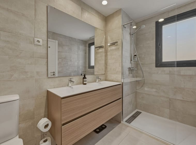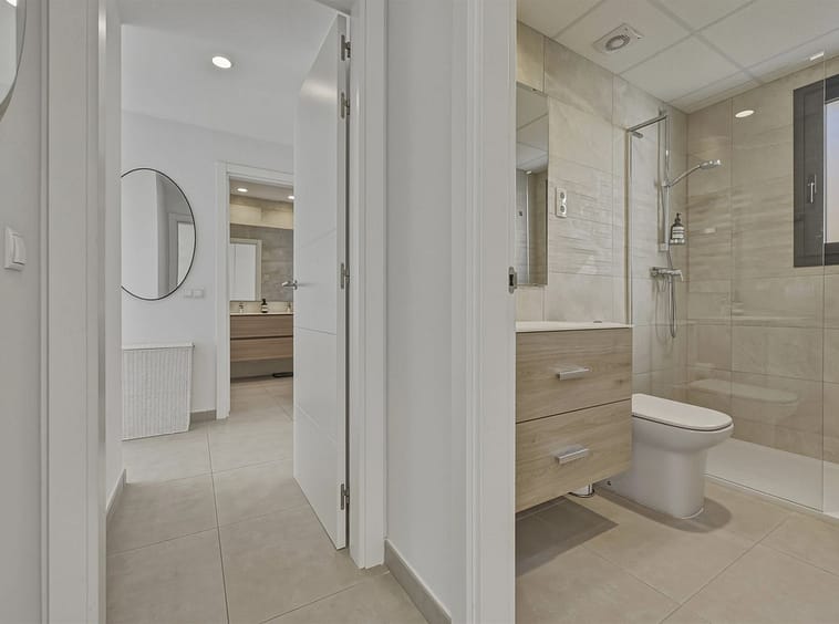 Bedrooms with Direct Terrace Access – The master suite enjoys direct access to the main terrace, allowing the panoramic golf views to be appreciated from both inside and out. The en-suite bathroom is spacious and contemporary, featuring a walk-in shower and double vanity. The second bedroom also benefits from direct terrace access and the same beautiful outlook, making it ideal for guests or family. A second modern bathroom with walk-in shower completes the accommodation.