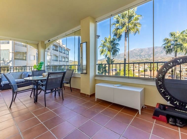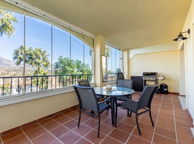 Located in a secure community with beautifully landscaped gardens, the property offers comfortable one-level living and an inviting, well-designed layout. The terrace enjoys impressive views over the Sierra de Mijas mountain range, and with glass curtains, you can make the most of the space all year round.