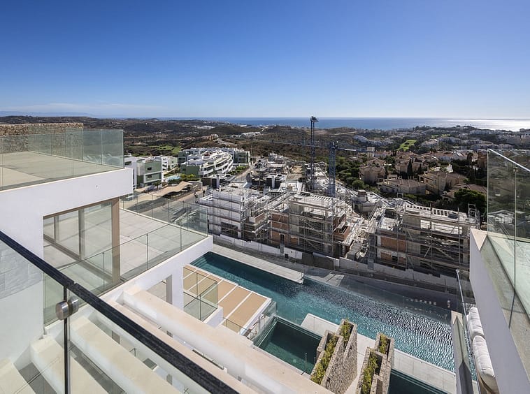 Amazing key ready 2-bedroom penthouse in La Cala de Mijas, boasting spectacular sea views. The upper level features a solarium with an outdoor kitchen and a jacuzzi. This boutique development prioritizes quality, functionality, and design, providing an exceptional living experience. Situated on the top floor, the penthouse offers breathtaking sea views from its strategic vantage point. Inside, a hallway leads to two bedrooms, with the master bedroom featuring an en-suite bathroom and stunning sea views. The modern open-plan kitchen seamlessly integrates with the living/dining area, which opens onto a magnificent terrace with 180-degree views of the Mijas mountains and the western Costa del Sol coastline. This apartment is ideal for relaxing and entertaining while enjoying panoramic views and showcasing your culinary talents to family and friends.