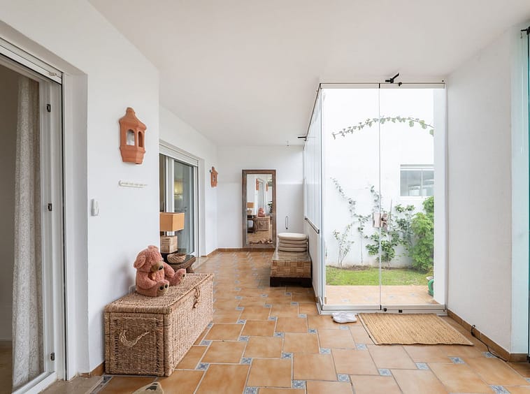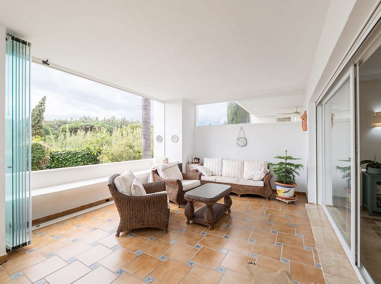 The apartment is bright and spacious and is sold fully furnished, ready for immediate occupancy. The layout includes two bedrooms, two bathrooms, and an additional guest toilet. The living area connects to a large enclosed terrace of 31 m², creating additional usable living space throughout the year. The property also benefits from a private garden area of approximately 20 m².