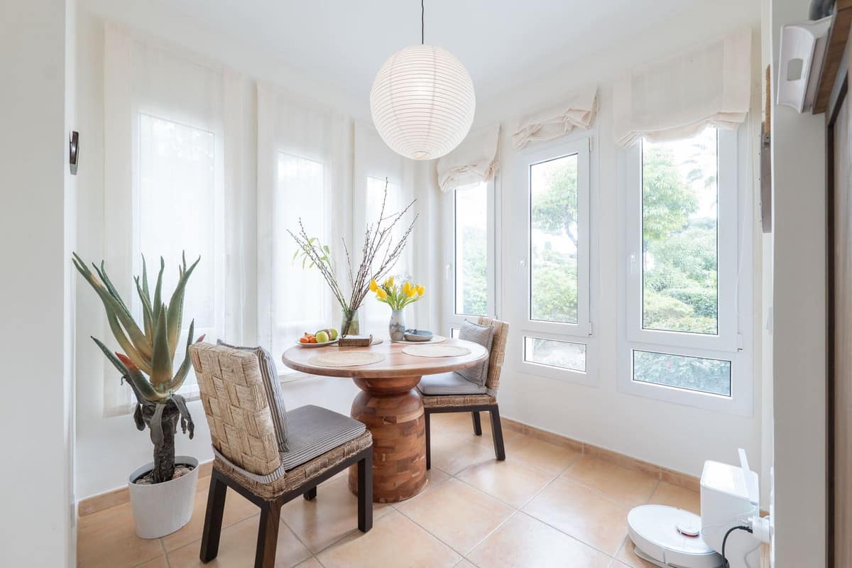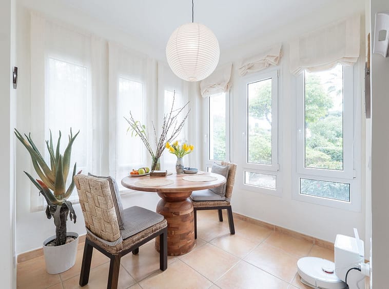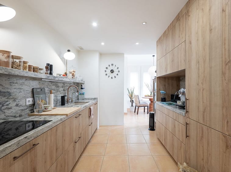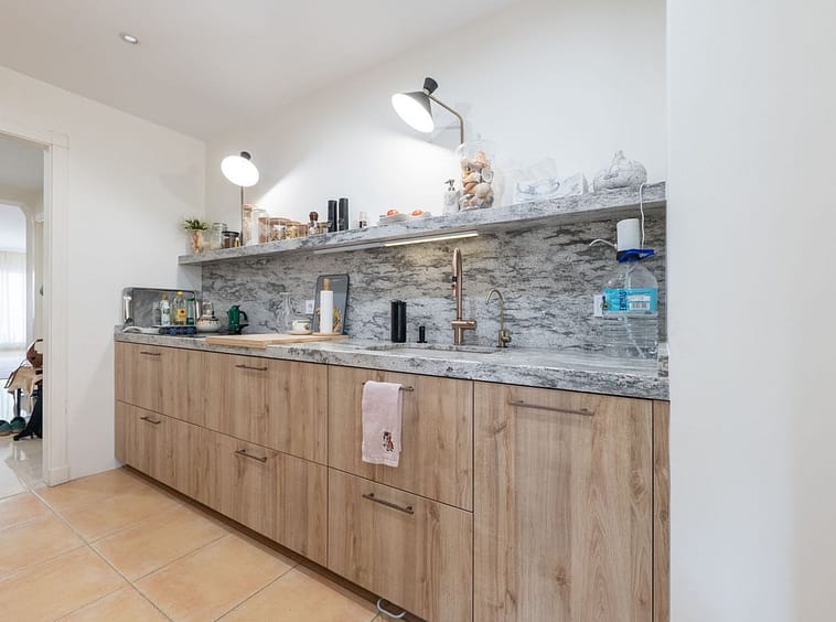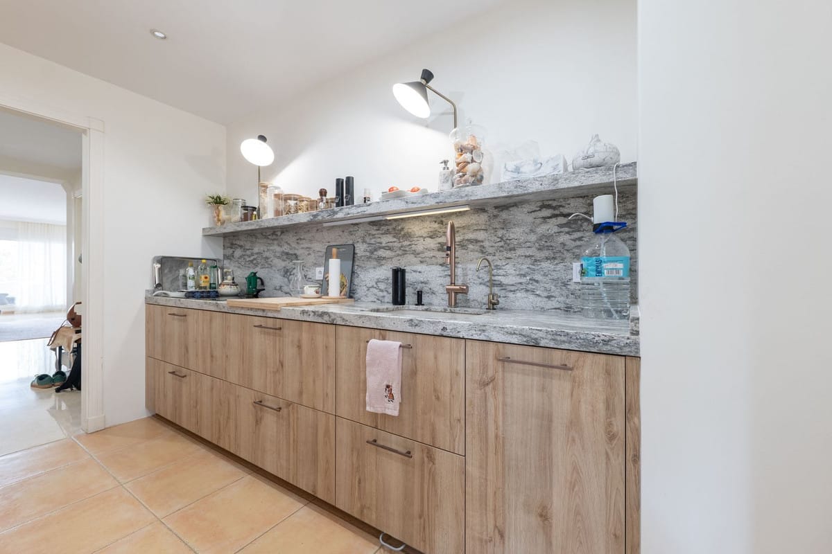 The kitchen has been newly installed with modern cabinetry and includes a water filtration system. Large windows and the ground-floor position allow natural light to fill the living spaces, creating a comfortable and open atmosphere.