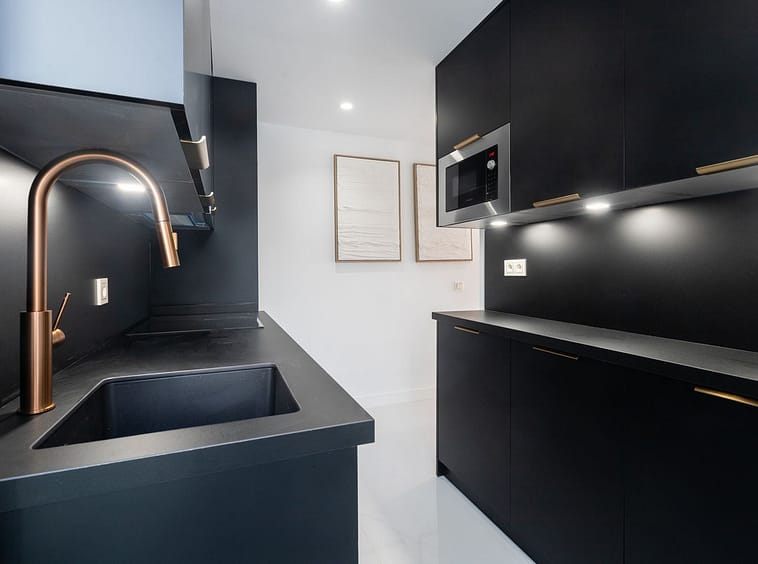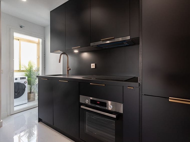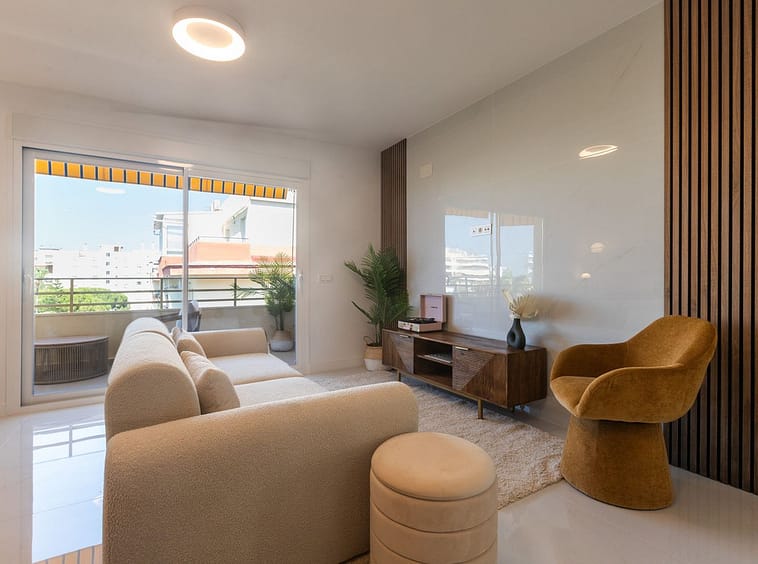The property offers 80m² built plus 9m² of terrace, ideal for outdoor dining or relaxing in privacy above the city. The terrace is directly accessed from the bright living-dining area, which flows seamlessly into the open-plan designer kitchen.