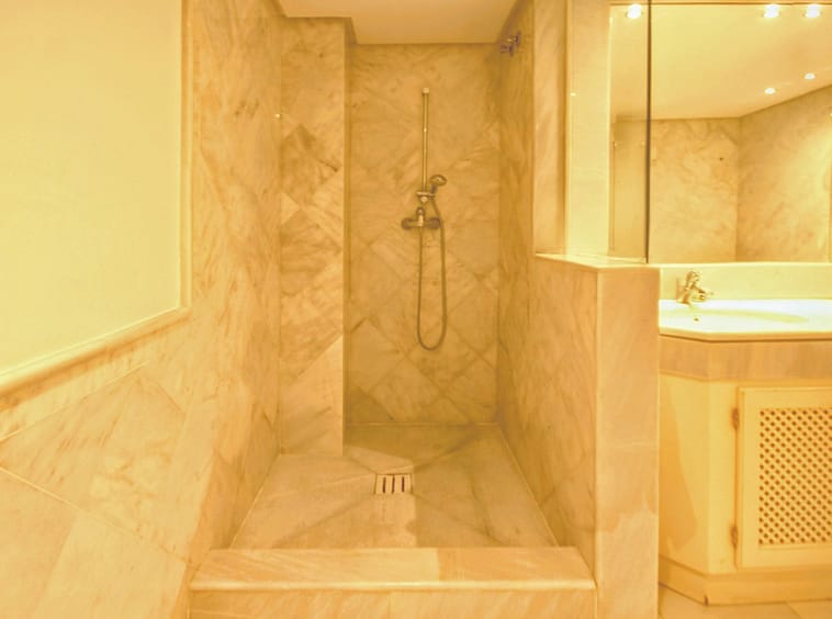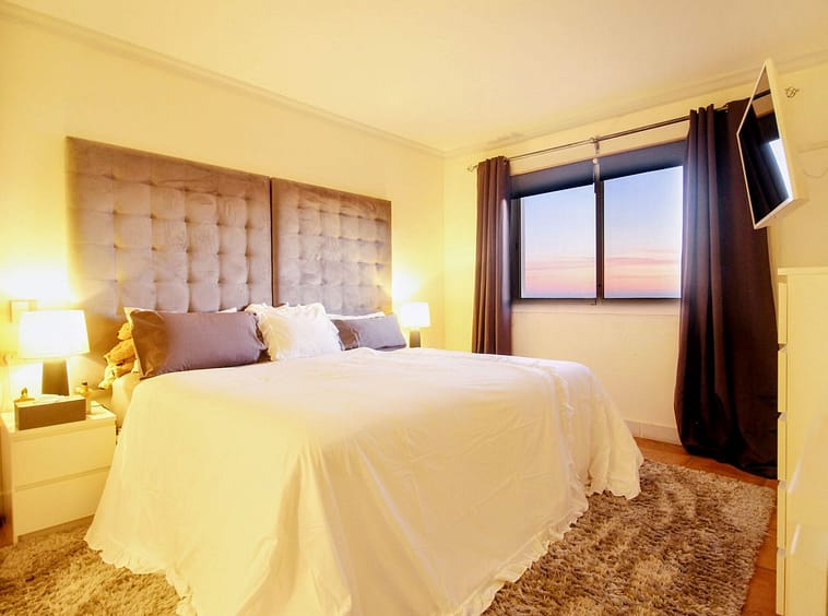 The master bedroom has wonderful sea views, built-in wardrobes, and a large en-suite bathroom complete with a shower and bathtub.
