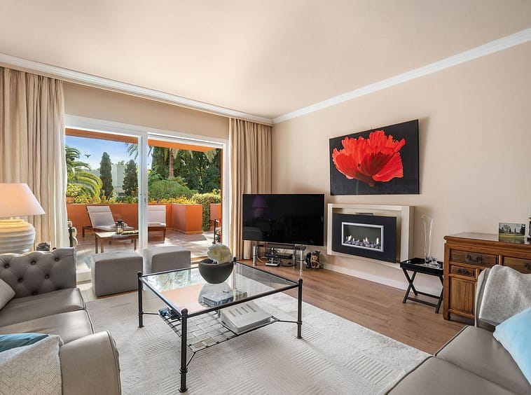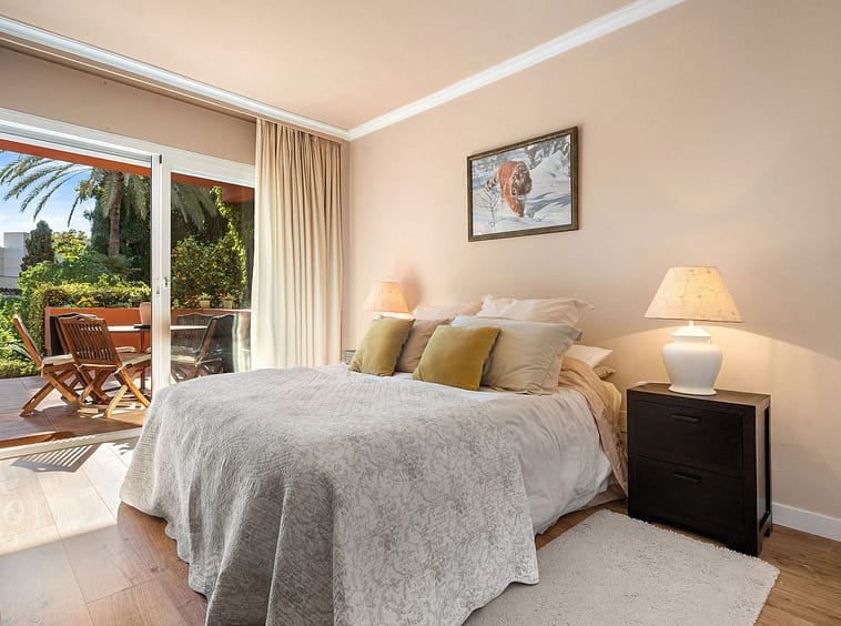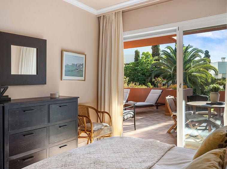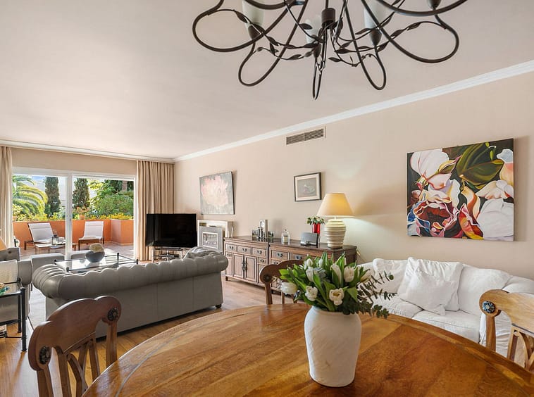 Just a short walk from the beach, this spacious two-bedroom apartment offers direct access to the beautifully maintained garden and swimming pool via a wide private terrace.