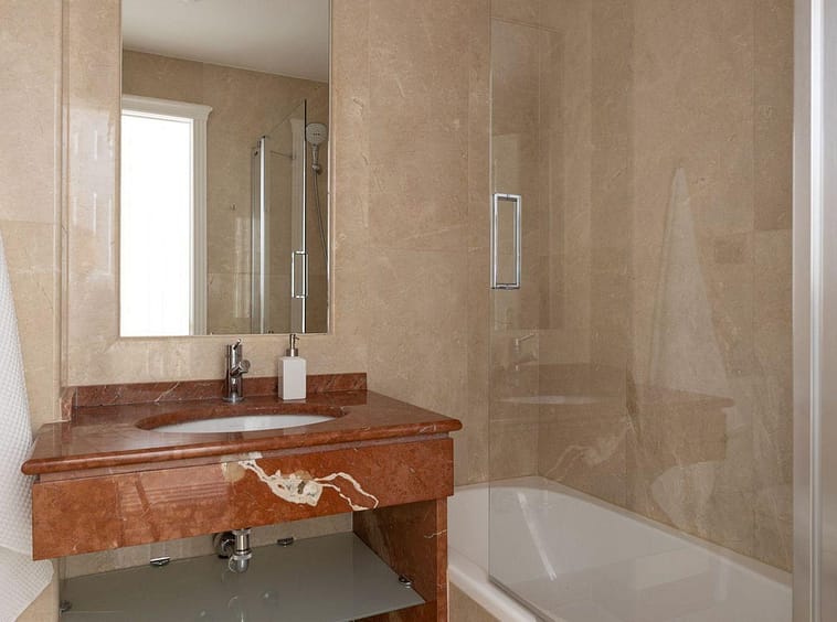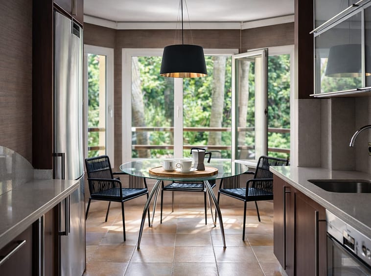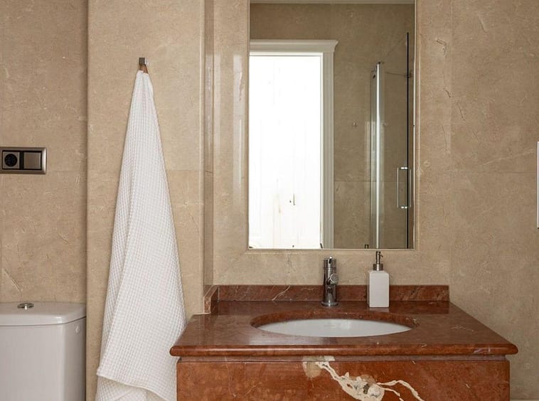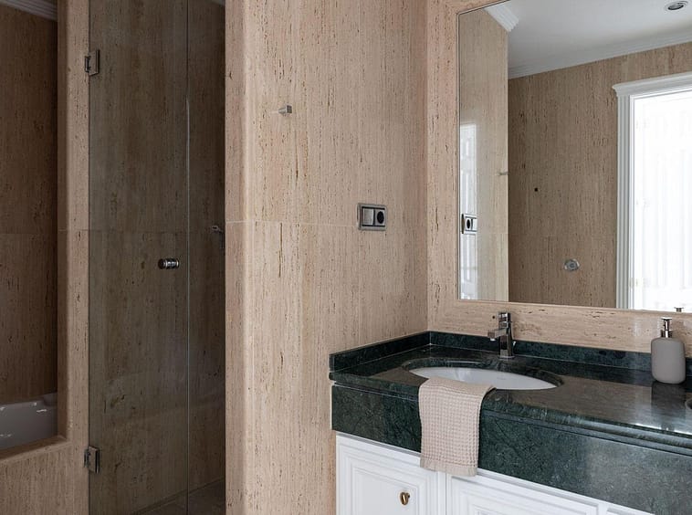 Enjoy the elegance of travertine marble walls on the terrace and a fully equipped kitchen with a cozy breakfast nook. The living and dining area connects seamlessly with a covered terrace, ideal for entertaining guests or relaxing while enjoying the breathtaking views.