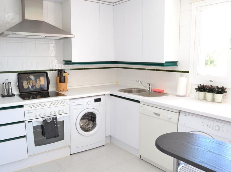 The property features a spacious living room with direct access to a large terrace designed for dining, lounging, and outdoor entertaining. The terrace captures both mountain and sea views, enhancing the sense of privacy and relaxation. The kitchen is fully equipped with modern appliances, including a dishwasher, washing machine, and dryer.