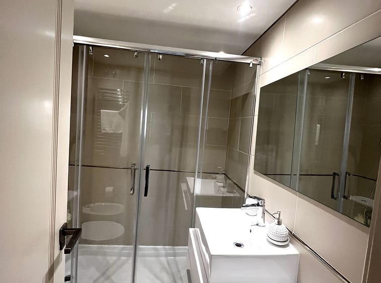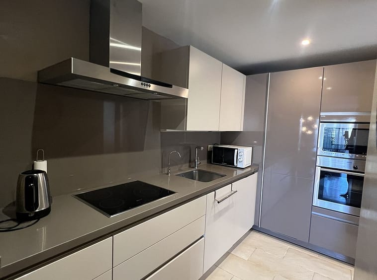Set on the fourth floor, the apartment welcomes you with an elegant entrance hall leading into a bright and spacious living–dining area that opens onto a generous terrace. A fully renovated designer kitchen enhances the home’s contemporary appeal. The master suite features terrace access and a refined en-suite bathroom, complemented by a comfortable second bedroom and full guest bathroom.