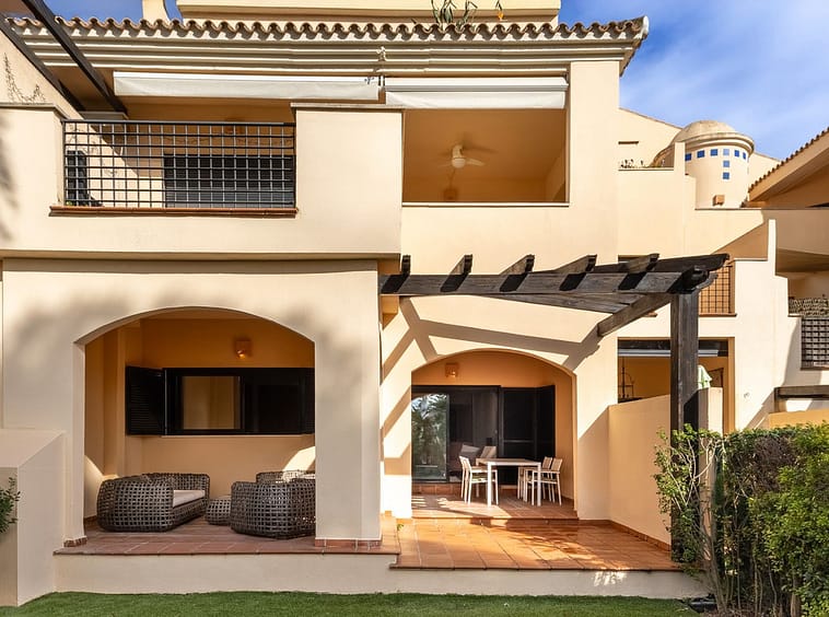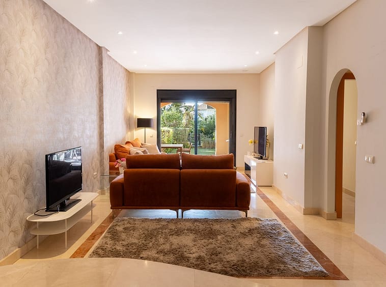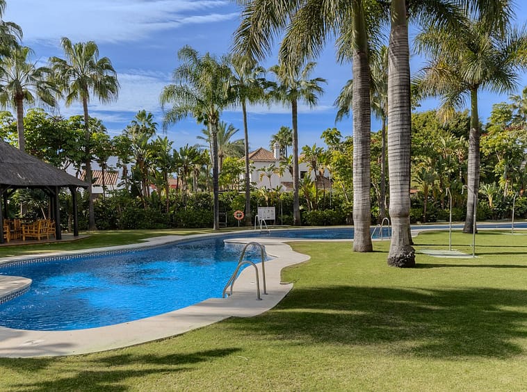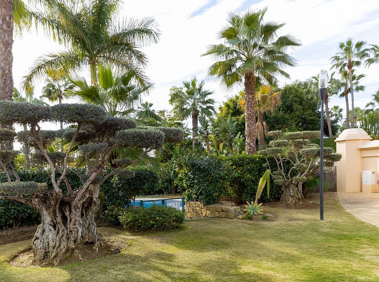 Very private South West facing garden apartment in this prestigious beachside development just meters from the sea only a short stroll to Puerto Banus. This 2 bed 2 bathroom 120m2 apartment has covered and uncovered terraces of 40m2 plus a private garden of 44m2 with steps down to the communal garden.