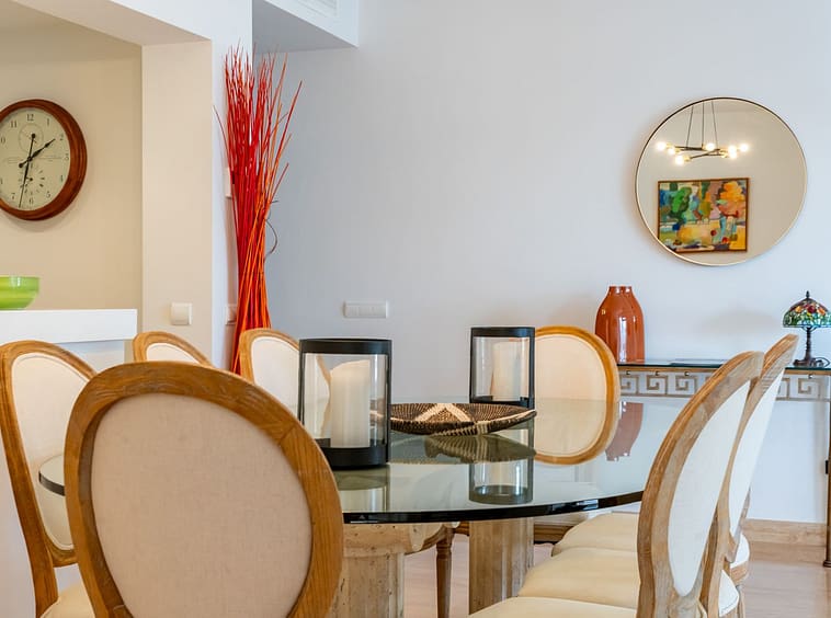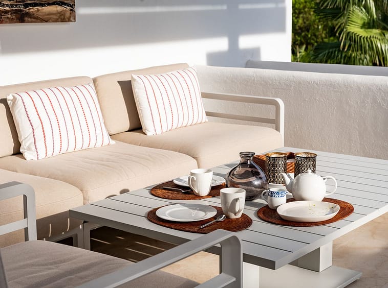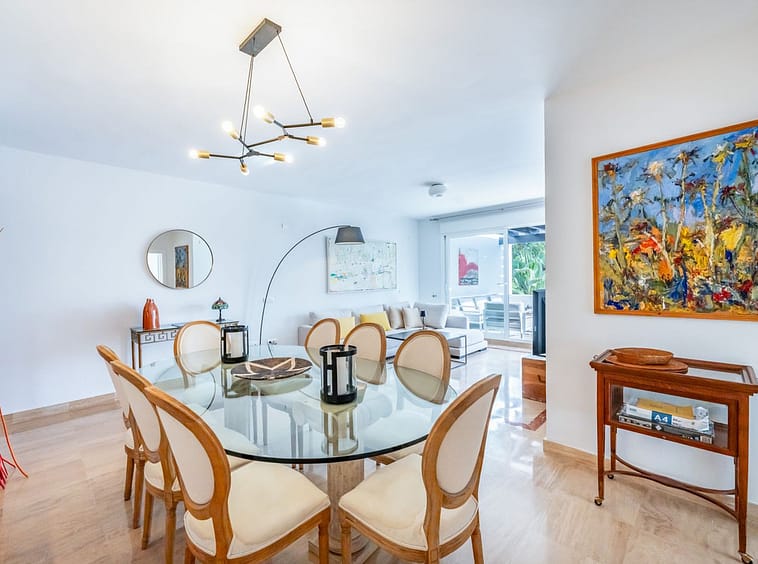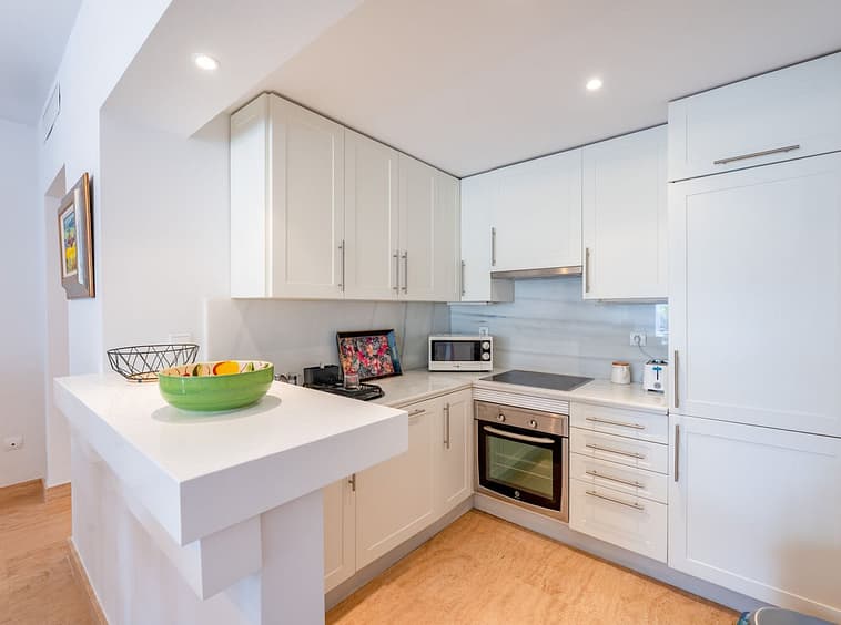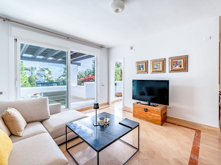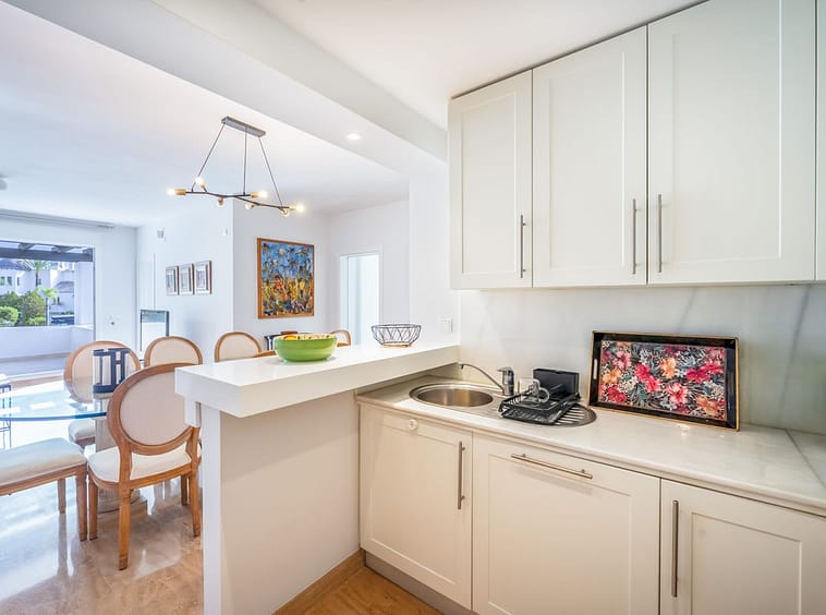 Originally a large one bedroom, this was converted to 2 bedrooms and one bathroom. As you enter the apartment, you are welcomed by the large open hallway that leads straight into the open plan lounge, decorated beautifully with high end furniture and fixtures. A cute white kitchen is to the right of the entrance and opens onto the dining room and lounge. Continue through the lounge and you come to the expansive, beautiful terrace that is facing the pool and south!