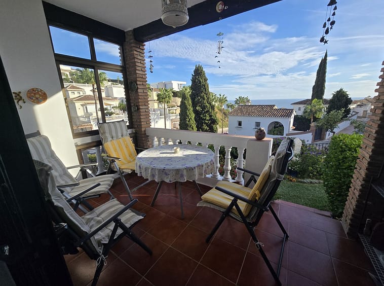 The terrace provides wonderful sea views and overlooks the communal gardens and pool area.