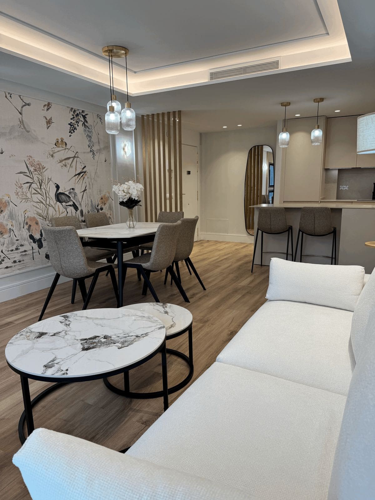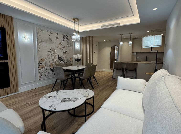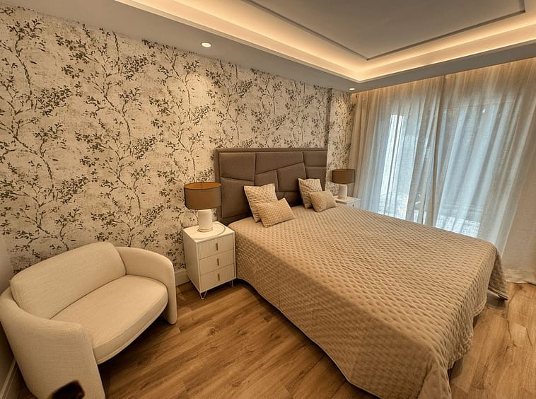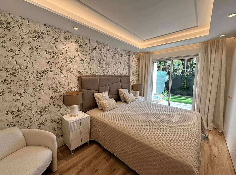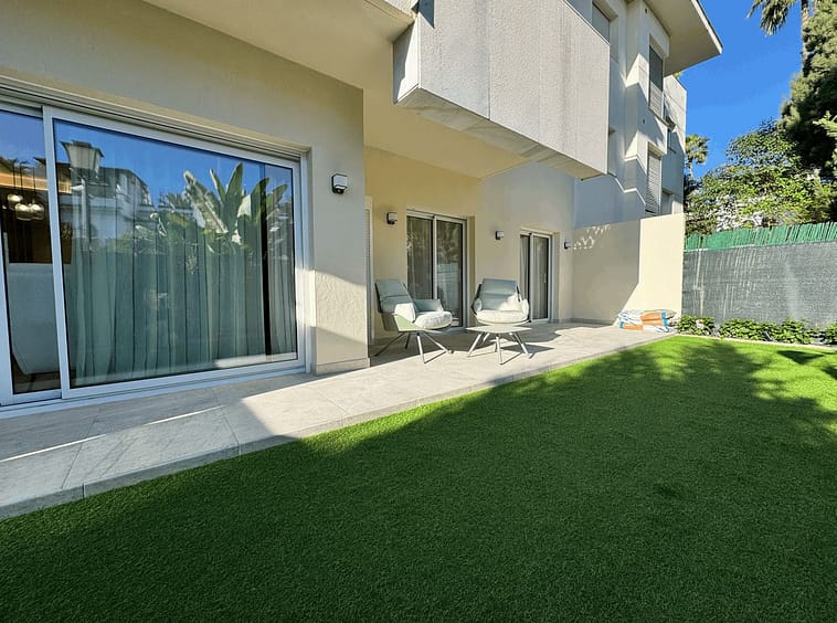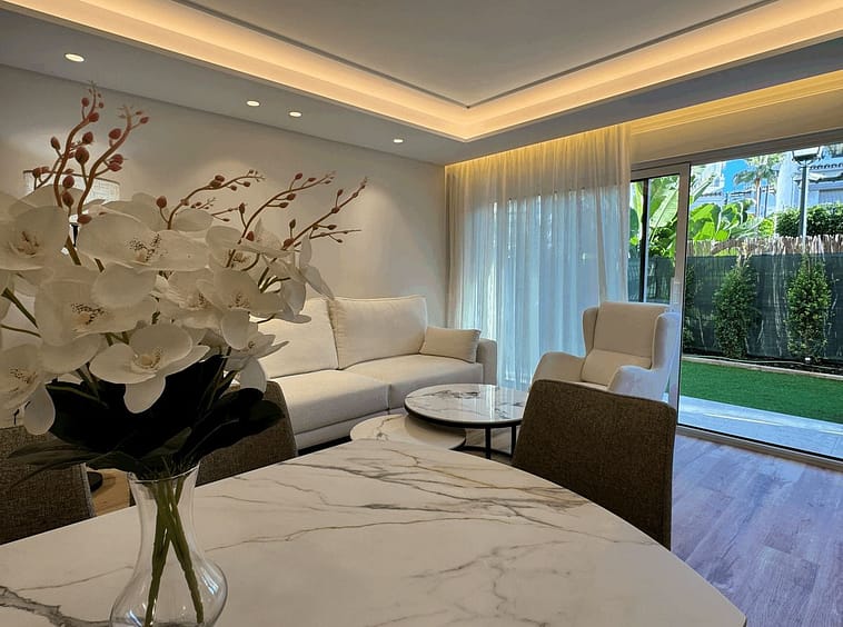 Fully renovated apartment in an urbanization Las Petunias Del Mar, second line beach, steps from the renowned Paseo Marítimo de San Pedro with its restaurants and beach clubs. This ground floor apartment consists of 2 full size bedrooms, 2 bathrooms, a living room with an open kitchen and a private garden. 92 m2 inside and 41 m2 outside. Refurbished to a very high standard, the promoter changed and improved everything, including pipes, electricity, air conditioning and windows with electrical shutters. The property is being sold fully furnished and decorated, key ready