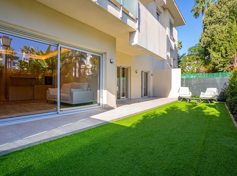 Apartment Petunias is a fully refurbished ground floor home in San Pedro Playa with a private garden. It offers two bedrooms and two bathrooms with walk in showers. The apartment has an LPO and sits in a gated beachside community.