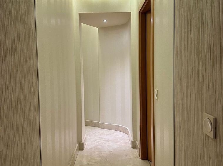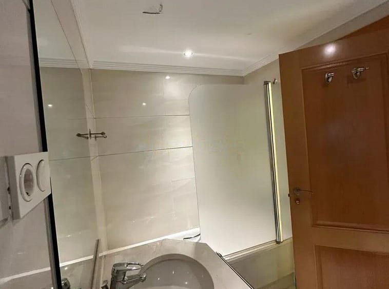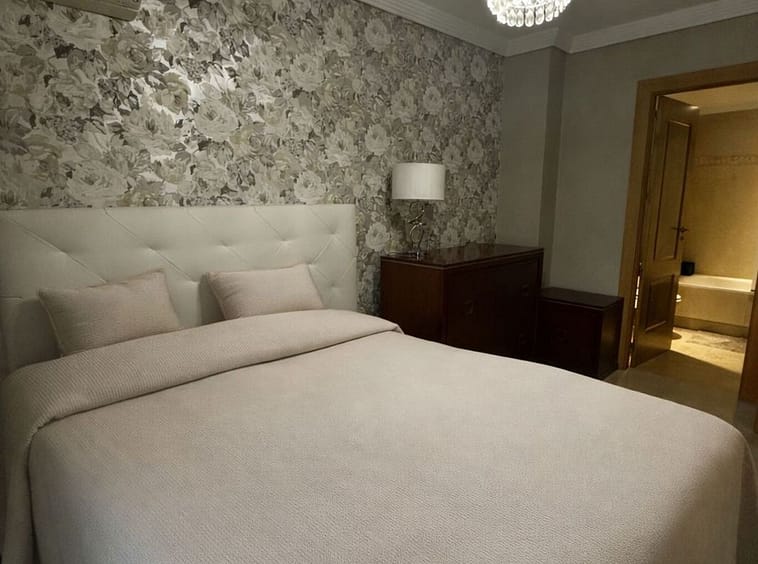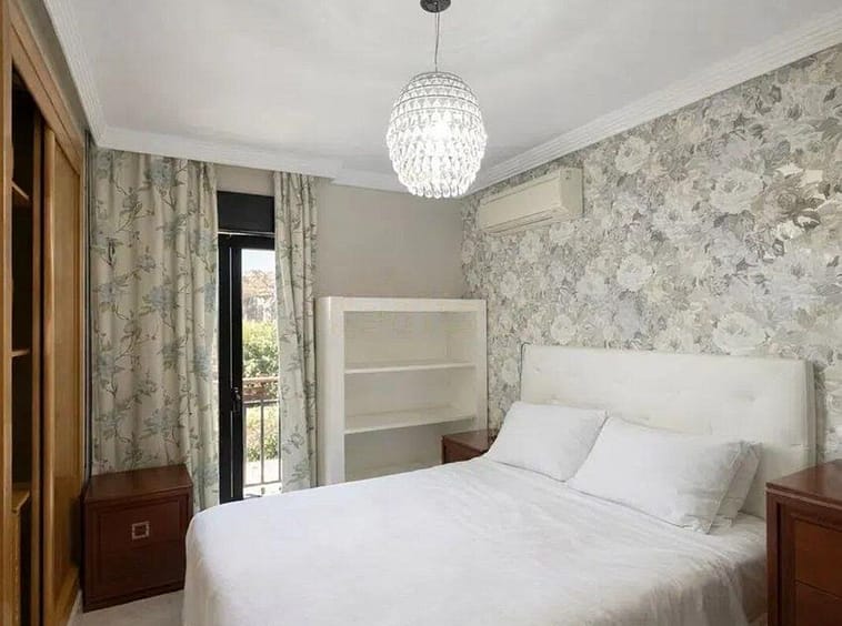 The interior layout offers two bedrooms and two bathrooms, including a master bedroom, a spacious living-dining room with a very cozy atmosphere, and a generously sized separate kitchen. The property has been modernized with a contemporary kitchen, renovated bathrooms, good quality flooring, and a neutral and elegant aesthetic. It has air conditioning, well-designed lighting, and practical storage solutions.