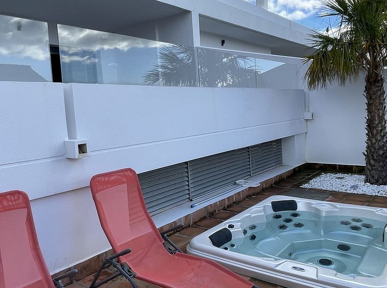 Spacious living with open plan kitchen and laundry area, sunny large terrace in two levels with hot tub.