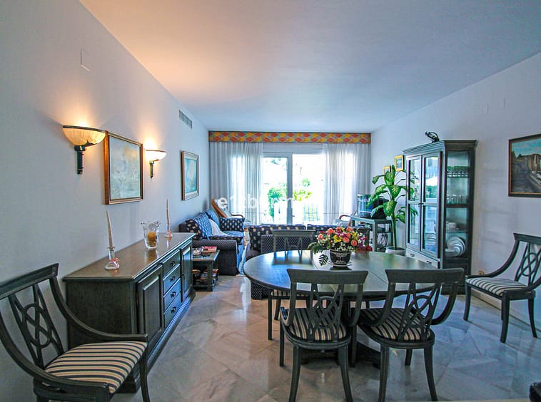 BEACHSIDE • WALKING DISTANCE TO MARBELLA CENTRE & ALL AMENITIES • Cheerful corner ground floor two bedroom apartment just steps from the beach. Located in a very desirable complex with lush mature gardens and swimming pool, right on the promenade, just a stone's throw away from all the restaurants and amenities of Marbella centre and Marbella's Golden Mile. The apartment consists of an entrance way, ample living/dining room, master bedroom with bathroom en suite, guest bedroom with balcony, bathroom, a functional fully fitted kitchen and utility room. The living room and master bedroom lead onto a quaint terrace, perfect for breakfast or al fresco dining. It has a private garden and direct access to the community swimming pool. A wonderful apartment for beachside living. Secure outdoor parking.