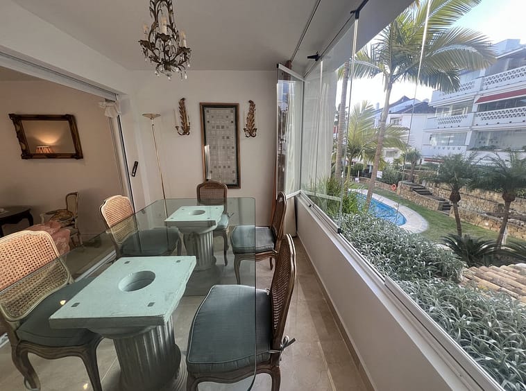 The apartment has a built area of 110 m² and features 2 bedrooms and 2 bathrooms, a renovated kitchen, and a spacious open-plan living and dining area with a west-facing orientation, enjoying the afternoon sun and pleasant views of the pool and gardens. Additionally, it includes a patio of approximately 8 m². The property comes with a designated parking space in the underground garage. Among its notable qualities are marble floors, air conditioning, electric blinds, and double-glazed windows.