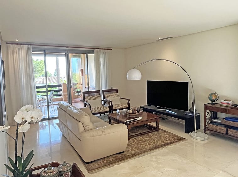 Located within the prestigious gated community Mansion Club, this elegant 2-bedroom, 2-bathroom apartment stands out as one of the finest residential offerings in the area. With a built area of 165 m² and a 41 m² south-facing terrace, it offers generous living spaces, natural light, and complete privacy. The terrace is fitted with glass curtains, allowing you to enjoy it year-round while taking in the lush tropical gardens and partial sea views.