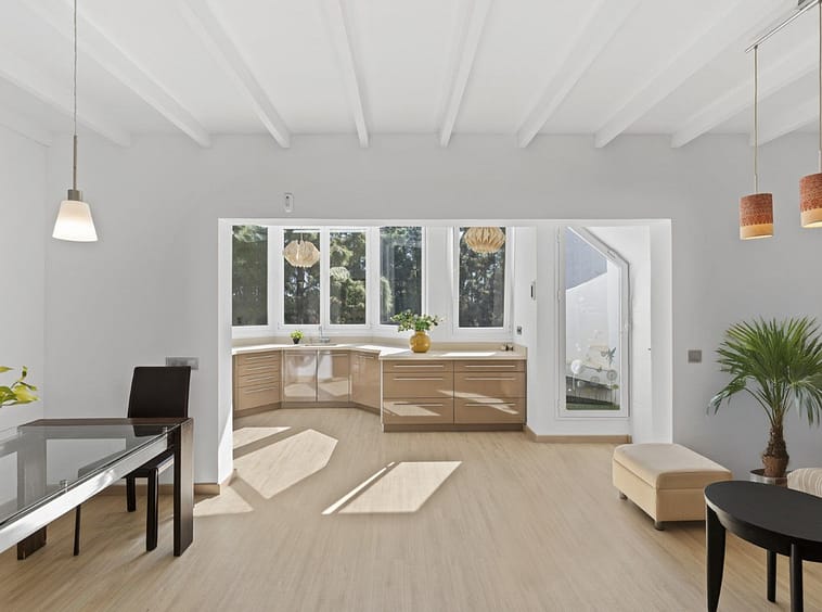 The generous living and dining area connects seamlessly with a modern open-plan kitchen, fully equipped and recently renovated with high-quality materials. Large windows allow sunlight to flood the interior throughout the day, adding warmth and a true sense of space.