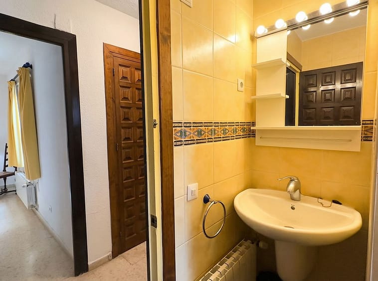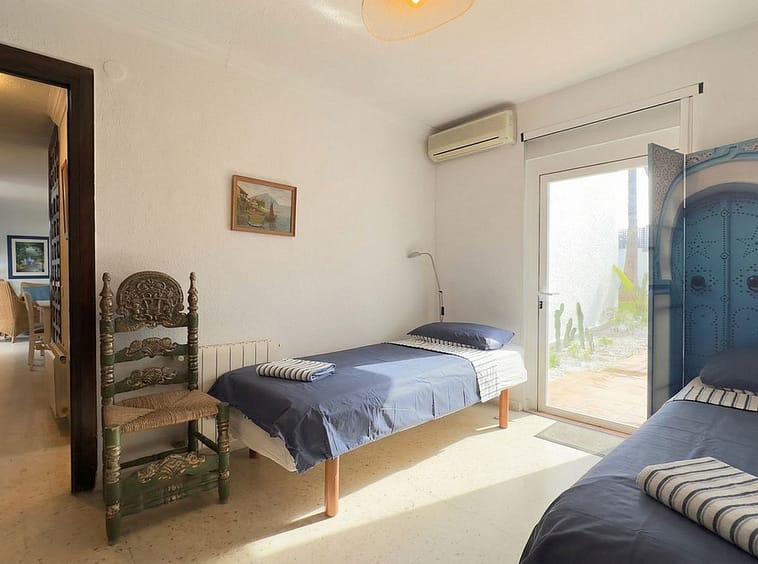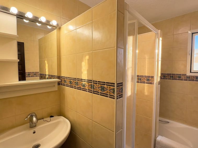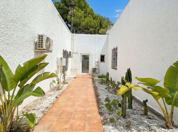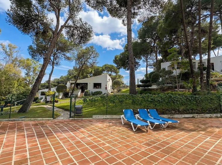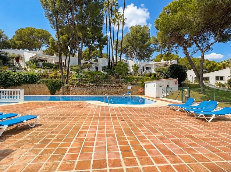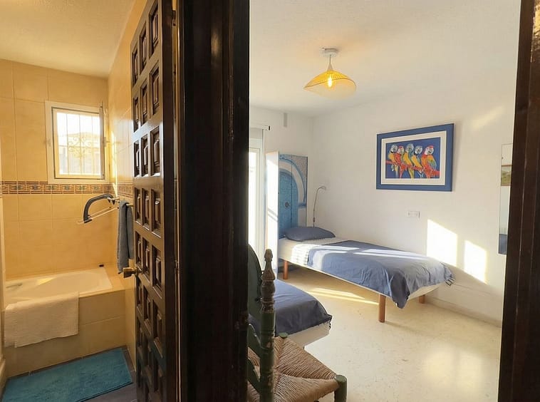 This typical Andalusian townhouse offers a comfortable and welcoming layout with 2 bedrooms, 1 bathroom plus a separate guest toilet, a bright living room with fireplace, and an open-plan kitchen. There is central heating (gas) and airco in living and bedrooms. Both bedrooms feature built-in wardrobes and their own washbasin, a practical and traditional detail. From the private terrace you can enjoy open views over the communal garden with mature trees, providing a peaceful and green setting.
