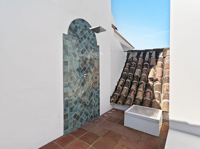 A private terrace provides an important extension of the interior spaces. Finished with traditional paving and enclosed by whitewashed walls, it offers a discreet and functional outdoor setting. The outdoor shower adds a distinctive element, allowing the space to be enjoyed comfortably throughout warmer months and reinforcing the indoor–outdoor relationship.