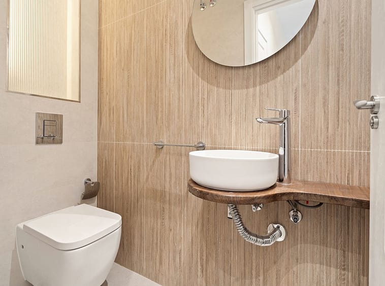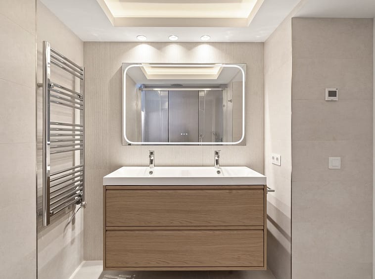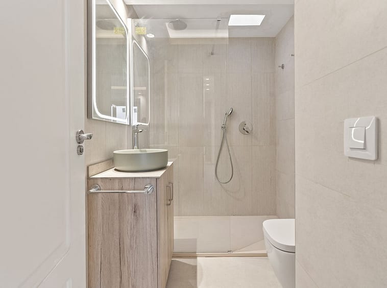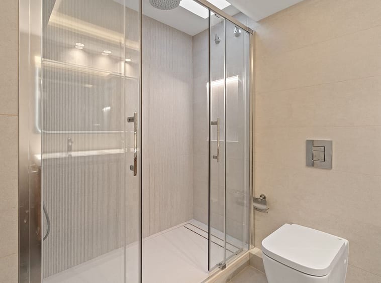 Bathrooms have been resolved with a contemporary and restrained approach, incorporating walk-in showers, refined fittings, and neutral textures. Storage solutions are integrated throughout the property, maintaining visual clarity while offering practical capacity.