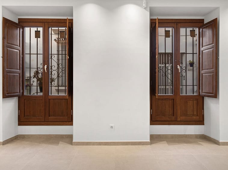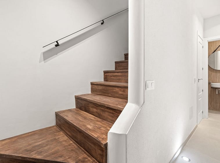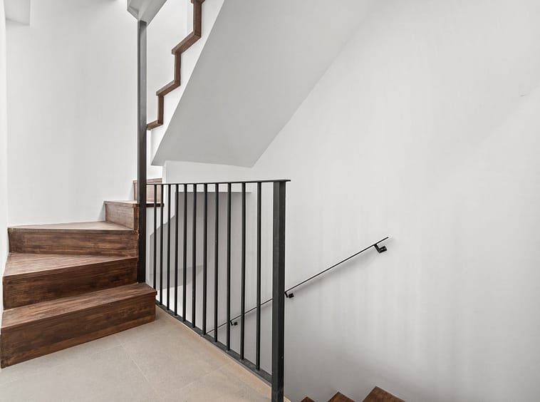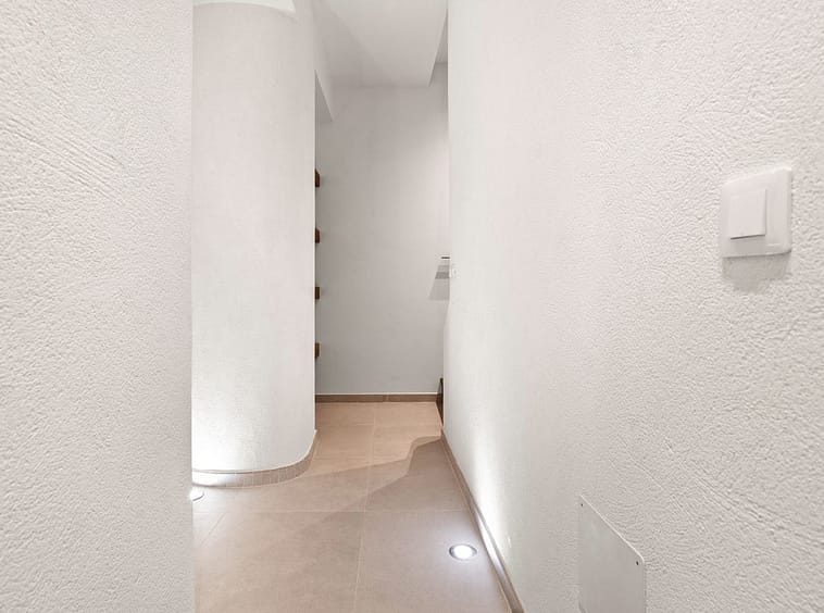 The entrance leads into a calm and well-defined interior where neutral tones and clean lines create a sense of continuity. Flooring, lighting, and carpentry have been carefully selected to enhance proportion and flow, resulting in spaces that feel both practical and understated. Natural wood details introduce warmth and contrast, reinforcing the connection between different levels of the home.