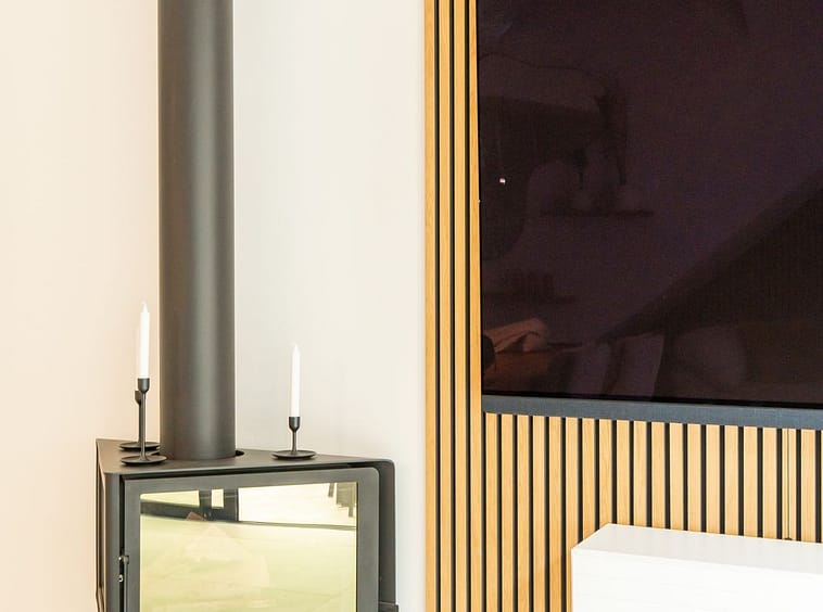 The main floor features an open-plan living and dining area, a stylish white kitchen, and a statement iron-and-glass fireplace. Large glass doors open onto a sunny private patio — ideal for dining or relaxing outdoors. An adjacent outbuilding houses a laundry area, toilet and shower, designed for both functionality and style.