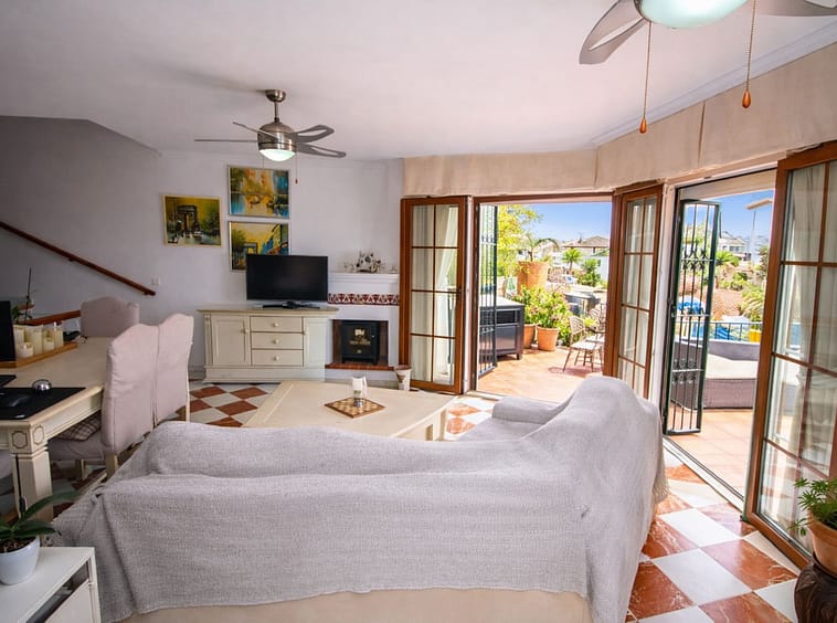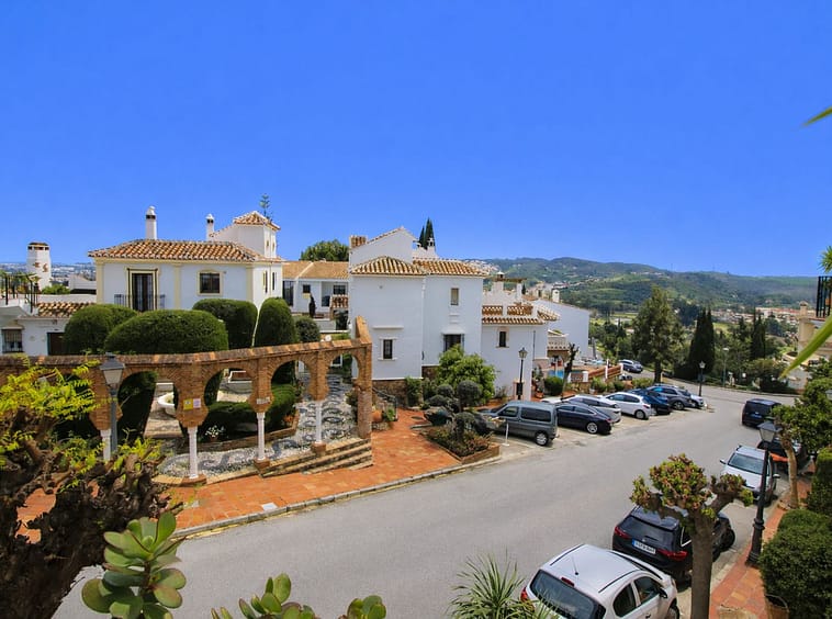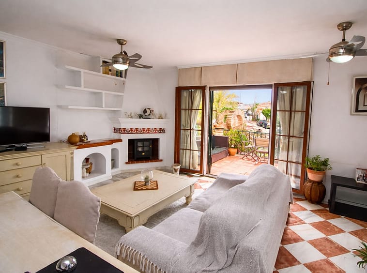 Set within the enchanting and highly sought-after Puebla Aida development in Mijas Golf, this charming two-bedroom townhouse offers a truly magical and peaceful setting, rich in authentic Andalusian character. Ideally located, the property is just a short drive from restaurants, supermarkets, and local amenities, while the beaches of Fuengirola are only 10–12 minutes away. The renowned golf courses of Los Lagos and Los Olivos are right on your doorstep, and the prestigious La Zambra 5-star hotel and spa is within easy walking distance. Distributed over two levels, the property comprises two bedrooms, two bathrooms, a bright and inviting living room, and a fully equipped kitchen. The lounge features a charming fireplace, creating a warm and cosy atmosphere, perfectly complemented by elegant marble flooring throughout. Both levels enjoy direct access to private terraces, offering a seamless indoor-outdoor lifestyle and showcasing beautiful sea and golf views—ideal for relaxing or entertaining while enjoying the tranquil surroundings. The bedrooms are generously proportioned and benefit from fitted wardrobes, while the two bathrooms add convenience and comfort for both residents and guests. Natural light enhances the sense of space throughout the home. Puebla Aida is one of the most unique and picturesque developments on the Costa del Sol, celebrated for its distinctive Andalusian architecture, charming walkways, and beautifully landscaped gardens. Residents benefit from multiple swimming pool areas, each offering a different atmosphere, along with stunning panoramic views throughout the community. Mijas Golf is not only home to two championship courses but also offers a relaxed residential environment with excellent nearby facilities, making this property ideal as a permanent residence, holiday home, or investment opportunity.