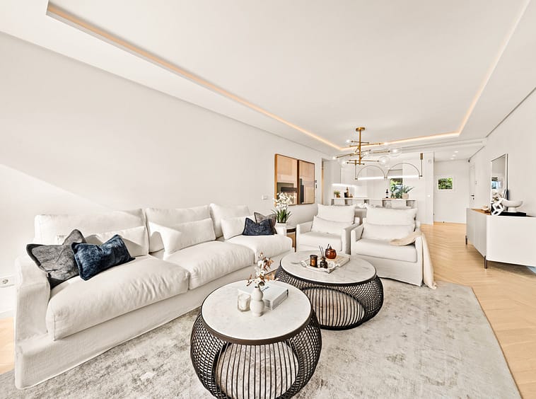 The living room features high-quality furniture, creating a refined yet inviting setting for relaxation. The modern open-plan kitchen comes fully equipped with top-of-the-line appliances.