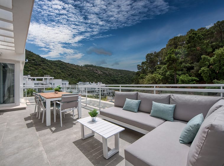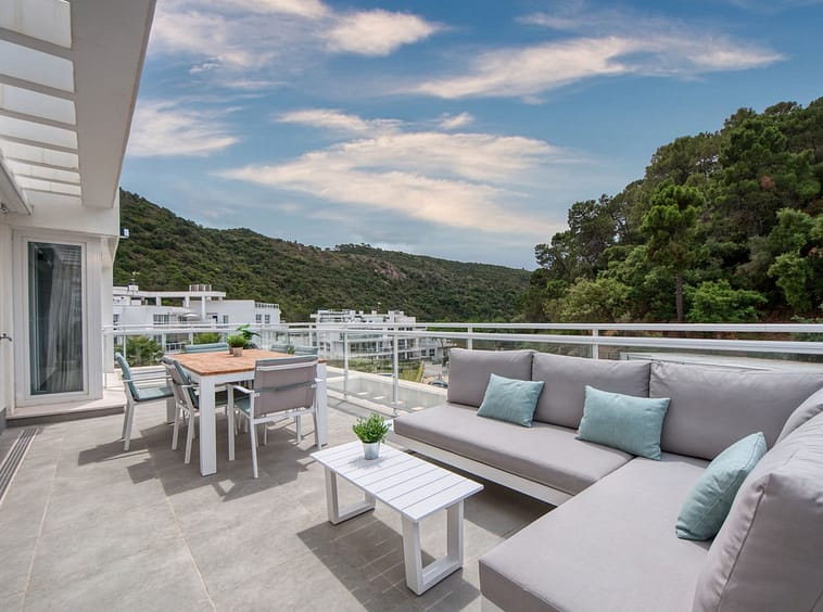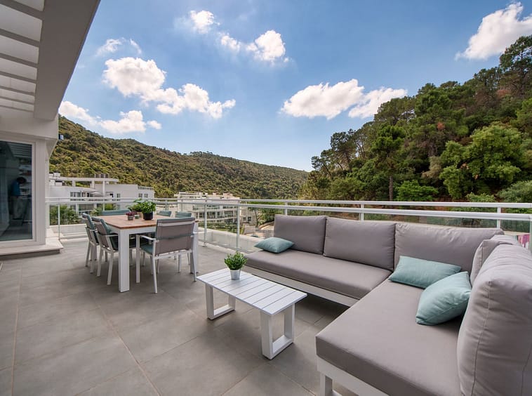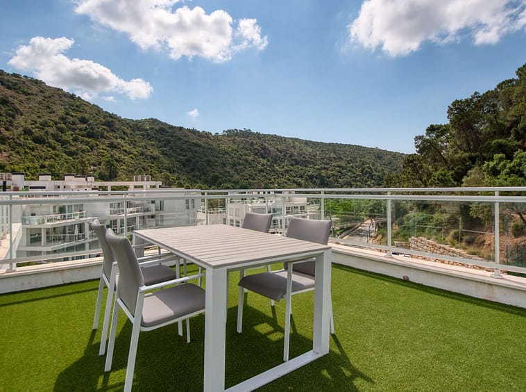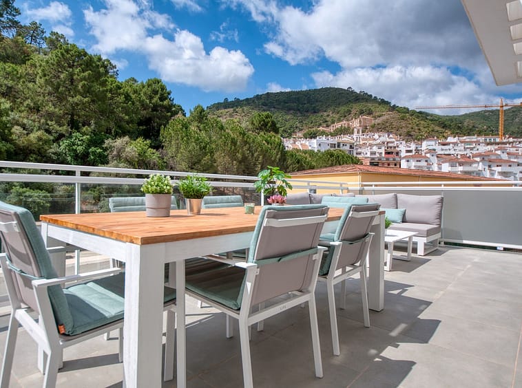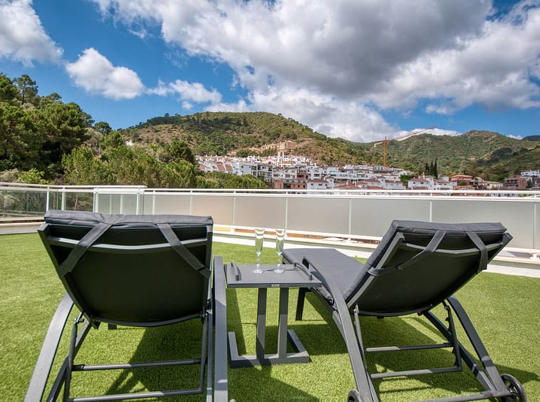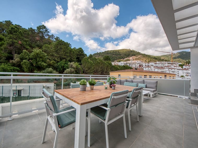 Spacious penthouse in Benahavis with the following layout. The main floor features an open-plan living area leading to a terrace with views over the pool and village. The modern kitchen is fully equipped with top-of-the-line appliances and additional storage.