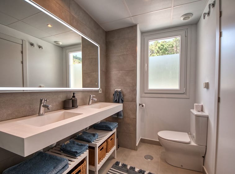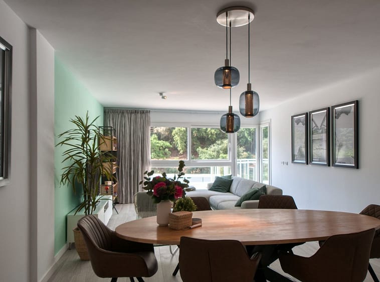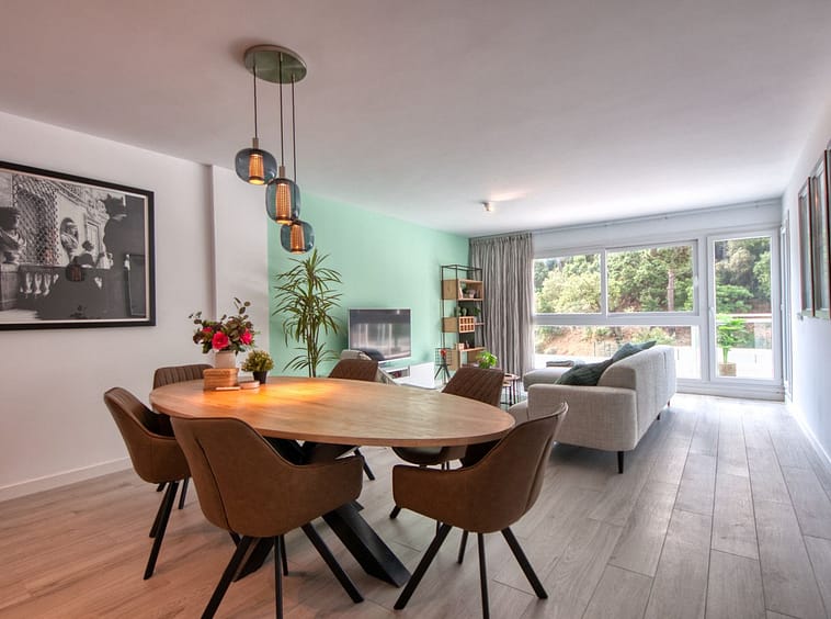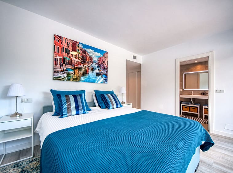 A sliding door separates the living area from the sleeping quarters, which include three double bedrooms with built-in wardrobes and electric blinds. The master bedroom has an en-suite bathroom and terrace access, while the other two bedrooms share a bathroom.