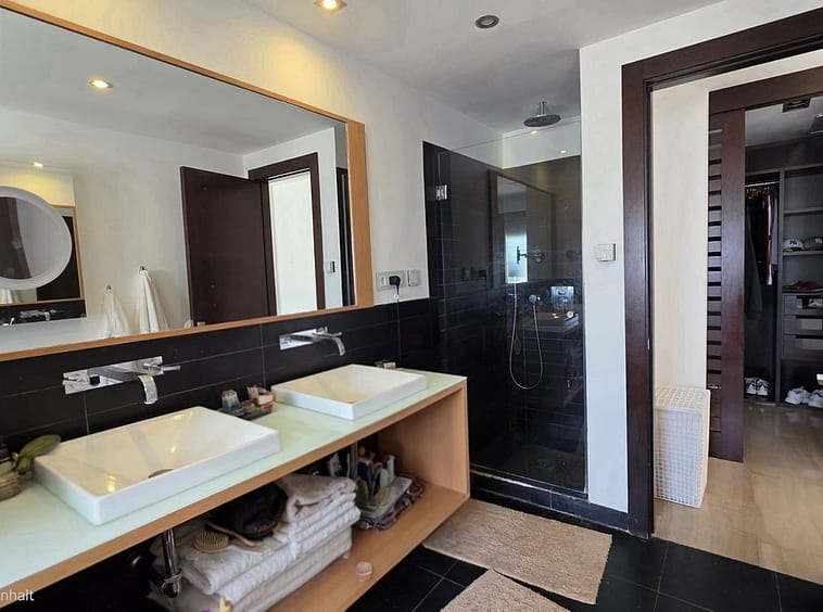 The generous master suite features a walk-in wardrobe and direct access to the terrace. On the opposite side of the apartment is the guest bedroom area, where one bedroom is en suite and also benefits from terrace access.