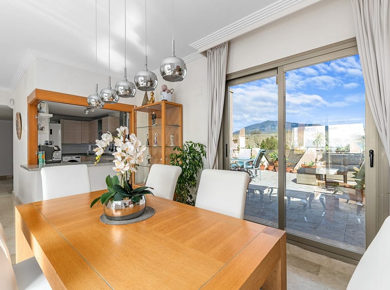 The apartment comprises of an entrance hallway, a semi-open kitchen leading into a bright and spacious living room with a separate dining area. These living spaces open onto generous terraces, perfect for enjoying both morning and afternoon sun while taking in the incredible views.
