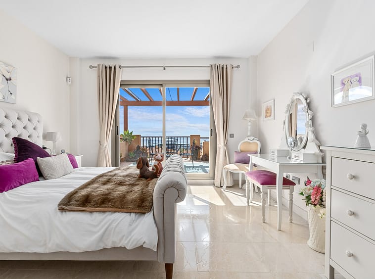 The large master bedroom features fitted wardrobes, an en-suite bathroom and direct access to a west-facing terrace. There are two additional double bedrooms, both with fitted wardrobes, which share a second bathroom.