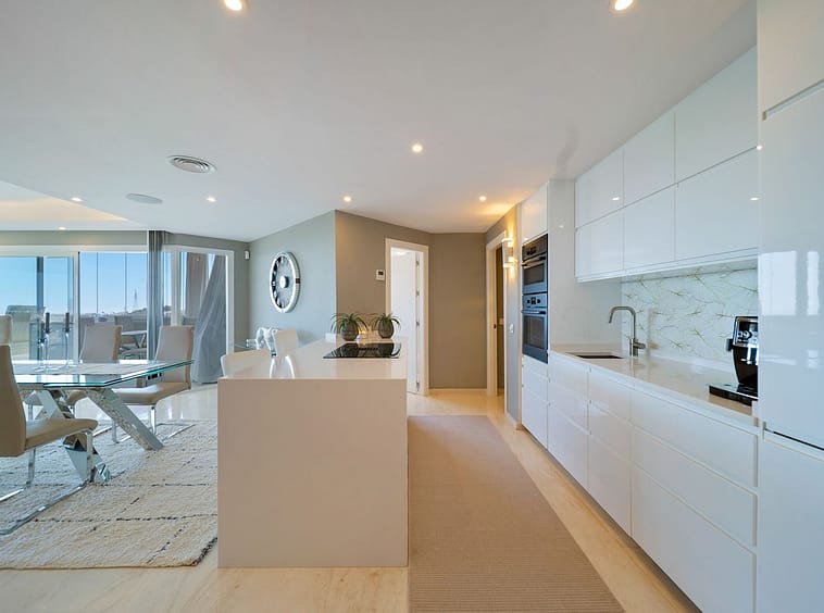 The apartment features a bright, fully equipped open kitchen with integrated high-end appliances. An elegant island bathed in natural light seamlessly connects to the main living area, creating a perfect space for cooking and socializing.