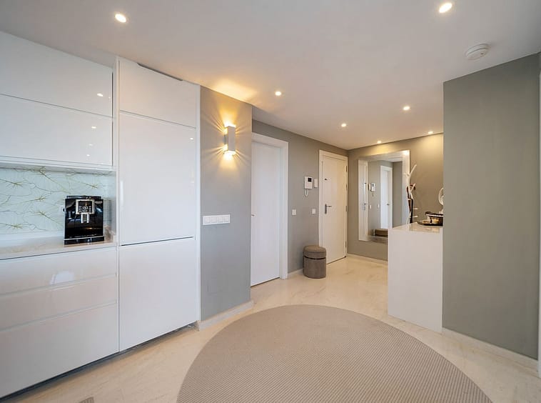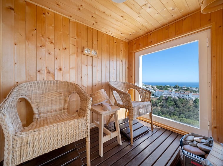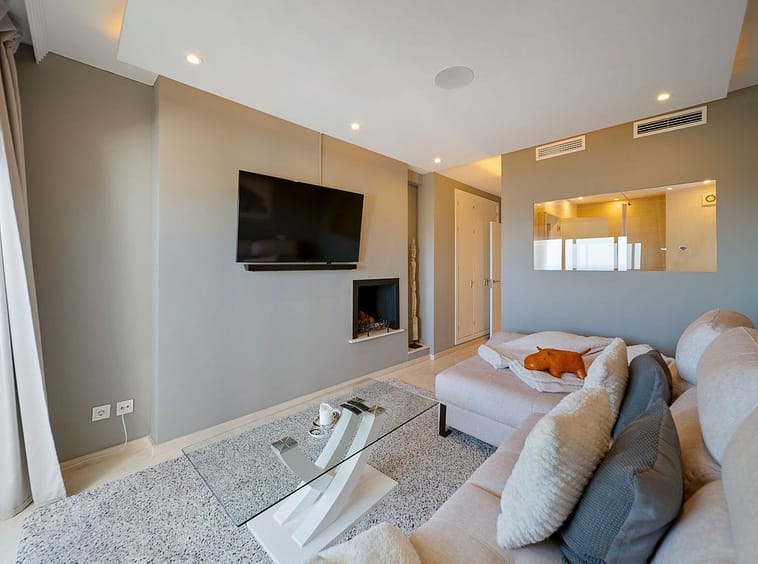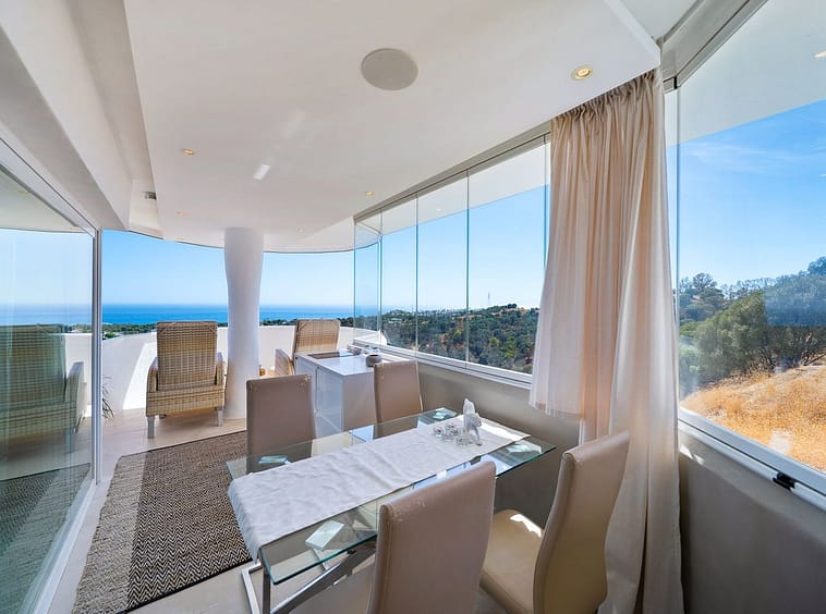 The property comprises 3 spacious bedrooms and 2 bathrooms. The main living area opens onto a generous terrace surrounded by glass curtains, perfect for enjoying spectacular views all year round. With a covered terrace and outdoor kitchen, it's ideal for entertaining friends and family over dinner. All bedrooms are well-sized with built-in wardrobes; one bedroom, currently set up as a cozy TV room with a fireplace, creates a warm, inviting atmosphere for cooler evenings. From this room, you have direct access to a smaller balcony with a Finnish sauna, where you can unwind and soak in stunning sea views. The third bedroom grants access to a storage and utility room for added convenience.
