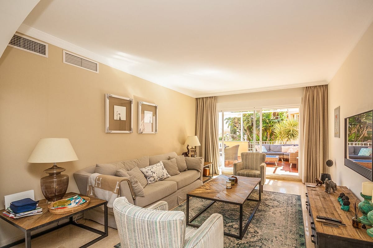 Discover this exceptional ground floor apartment located in the sought-after area of Elviria, perfectly positioned within a secure and well-maintained urbanisation. Offering 131 m² of built space plus a generous 35 m² private terrace, this property combines comfort, style, and an unbeatable location. The apartment features three spacious bedrooms and two modern bathrooms, including a master bedroom with an en-suite bathroom. Designed for comfortable living, it boasts marble flooring, fitted wardrobes, double glazing, and excellent overall condition throughout. The bright south-east orientation allows for plenty of natural light, while the private terrace offers lovely views over the communal gardens and pool — an ideal space for relaxing or entertaining. The fully equipped home also includes air conditioning with hot and cold settings, a utility room, storage room, and convenient access to underground private parking and a garage. Located close to golf courses, shops, the beach, and schools, and with easy access to transport links, this property is perfectly suited as a permanent residence, holiday home, or investment opportunity. Set within a gated complex with 24-hour security and a beautiful communal pool area, this apartment offers both peace of mind and a high-quality Mediterranean lifestyle.