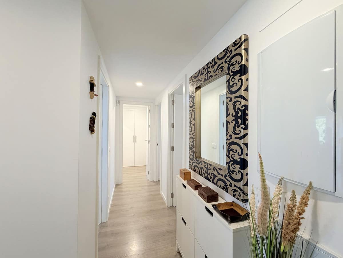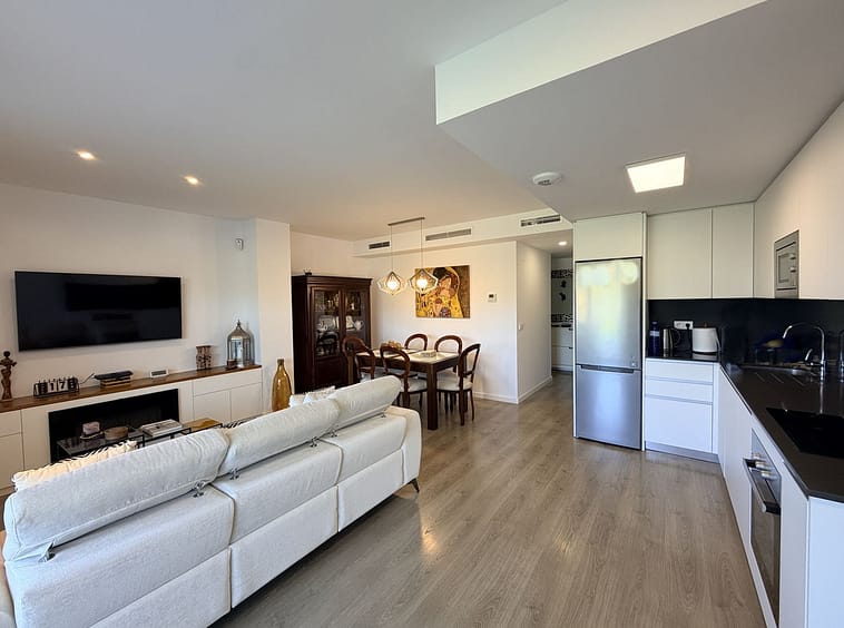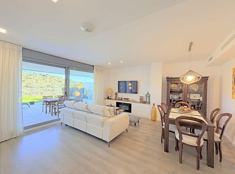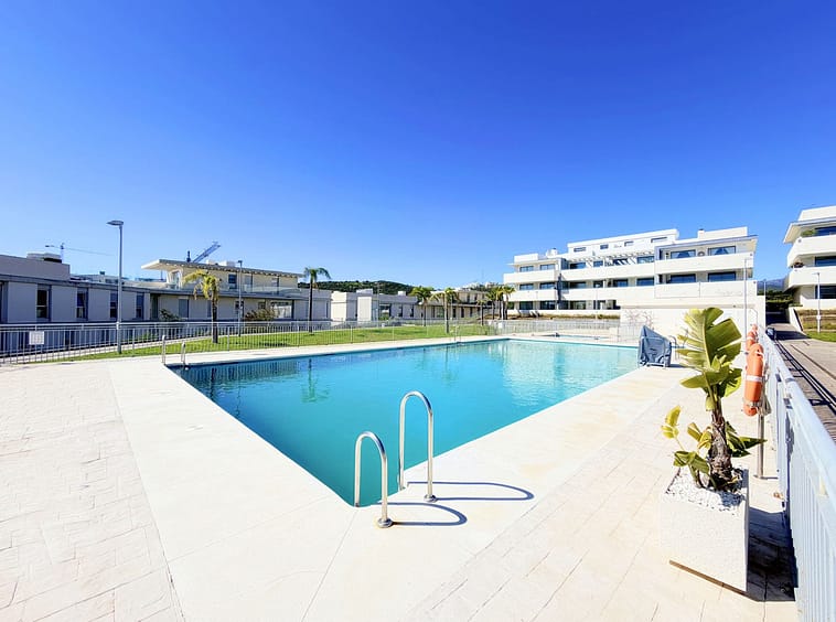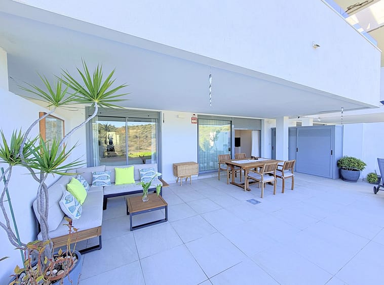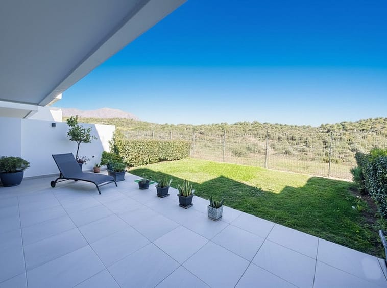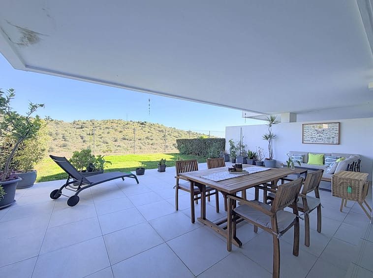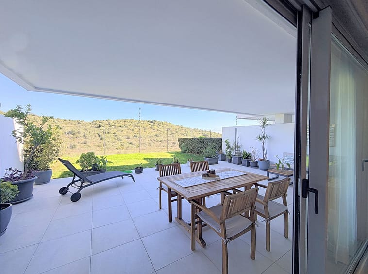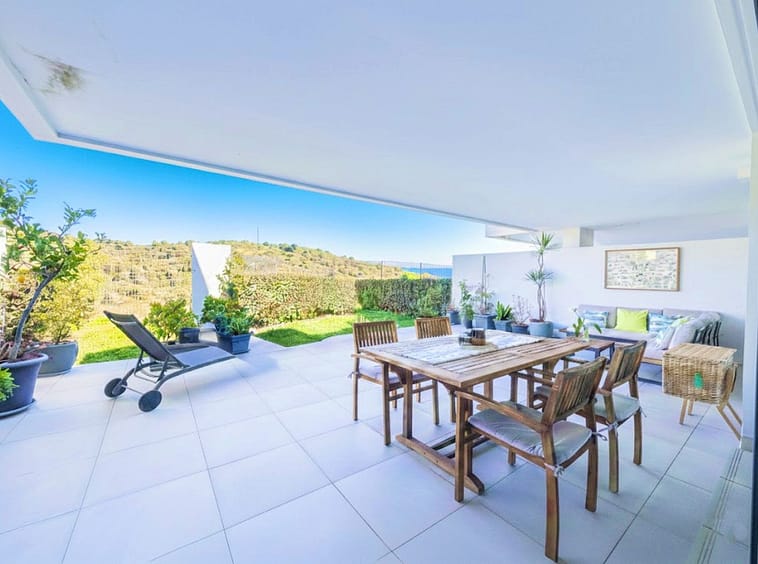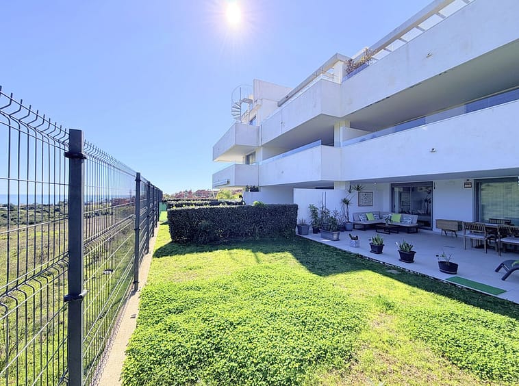 Fantastic ground-floor apartment with a large private garden and open views of the sea and mountains, located in Estepona, in a contemporary residential complex completed in 2021, just 5 minutes by car from the town center and 15 minutes from Sotogrande. The development, with modern design and clean lines, features a swimming pool and well-maintained green areas, creating a pleasant and highly valued environment. The property is in excellent condition, with high-quality renovations and finishes throughout. The open-plan living area combines lounge, dining space, and fully equipped kitchen with custom storage solutions. From here, you can access a spacious covered terrace, ideal for year-round enjoyment. Other upgrades include motorized blinds with a security locking system. The private garden adds a highly desirable extra, providing space, privacy, and multiple possibilities to create different outdoor areas. The master suite features a dressing area, direct access to the porch, and a fully renovated bathroom. A parking space and storage room are included, adding practicality and convenience. An ideal opportunity for those looking for a modern, comfortable home ready to move into, perfect as a permanent residence or a second home on the Costa del Sol.